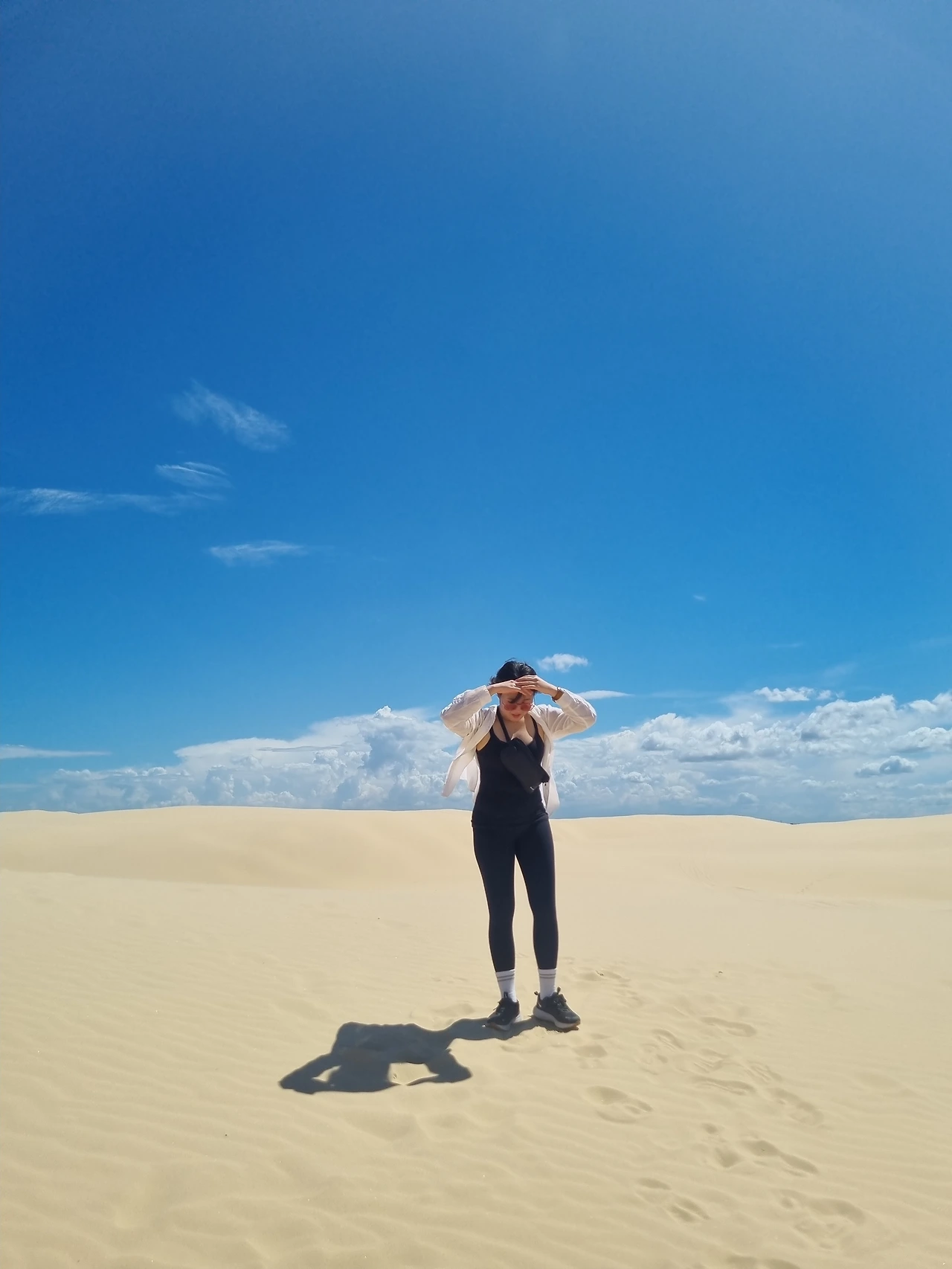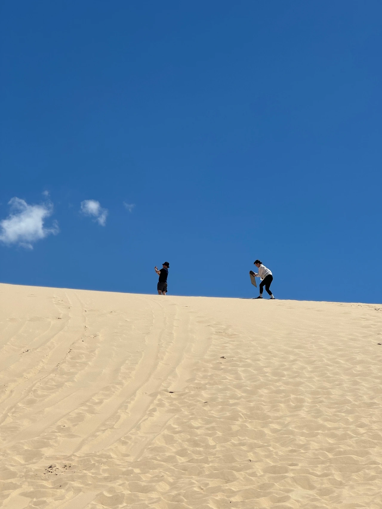 그리고 사막으로 이동했다. 사막투어는 모래 썰매를 타는 것이다. 사막에 도착해서 큰 모래 산이 있는 곳까지 사륜 자동차로 이동했다. 그리고 그곳에서 썰매를 집었다. 썰매를 타려면 저 높은 모래 산을 올라야 했다. 그 모래 꼭대기에 오르는데 정말 힘들다. 사막에 오기 전에는 썰매 10번은 타야지 생각했는데 4번밖에 못 탔다. 한번 오를 때마다 에너지가 절반이 소진된다. 내려오는 것도 마음처럼 빠르게 내려가지 않았다. 썰매를 탄다기보다는 훈련을 한 기분이었다. 게다가 땡볕아래였고 살짝은 습하기도 해서 땀과 모래가 뒤엉키기 시작했다. 4번밖에 안 탔는데 체력이 바닥났다. 다행히 투어도 마무리되어 숙소에 들어갔다. 들어가자마자 침대에 쉬지 못하고 바로 샤워를 했다. 레깅스 안으로 모래가 다 들어와 있었다. 쉽지 않은 투어였다.