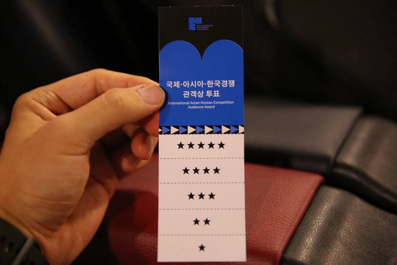 영화를 보러 들어가면 경쟁 부문 투표를 위한 용지를 주는데, 자신이 생각하는 별점을 뜯어서 통에 넣는 방식입니다. 그러나, 어떻게 하는지 이해를 하지 못해 나올때 보니 그냥 용지 채로 투표함에 넣은 관객이 많았습니다. 제가 정확하게 별점을 뜯어서 넣자, 통을 들고 계시던 자원봉사자 분이 눈빛으로 하이파이브를 보냈습니다. 실제로 그랬는지 확인할 길이 없으니 그런걸로 믿고 있겠습니다.