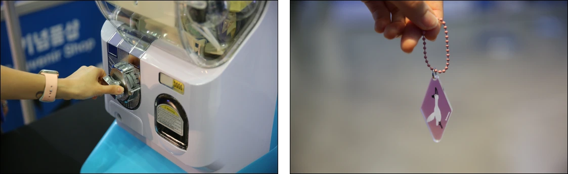 굿즈를 사지 않아도, 기념품을 얻을 기회가 있습니다. 예매를 하면 기념품 뽑기를 할 수 있습니다. 윤프, 영평 둘 다 금속배지를 기대하며 레버를 돌려봤지만.... 결과는 둘 다 키링. (영평에게 왜 또 키링 뽑았냐고 한 소리 들었습니다)