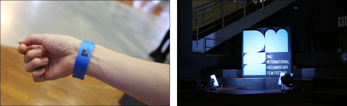 팔찌를 차니 지하 스테이지에서 비트에 맞춰 손을 위아래로 흔들어야 할 것 같지만, 그런 마음은 접어두고 상영관을 둘러봅니다. 조용했던 바깥과는 다르게 실내는 관객이 꽤 많았습니다. 안쪽에는 영화제 로고가 빛나고 있습니다. 조금 더 번쩍거리면서 연기가 나면 팔찌와 컨셉이 잘 맞을 것 같은데, 그렇지는 않습니다.