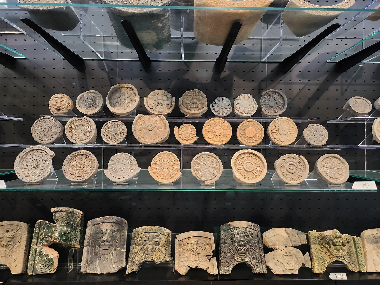 시대별로 정리된 수막새 코너이다. 기와 중 길쭉한 것은 수키와, 넓적한 것은 암키와인데, 수막새는 수키와의 끝을 막는 장식용 기와이고, 암막새는 암키와의 끝을 마감한다. 수막새에 새겨진 무늬와 패턴은 고구려, 백제, 신라, 통일신라 등 각 시대와 문화를 구분하는 단서가 된다.