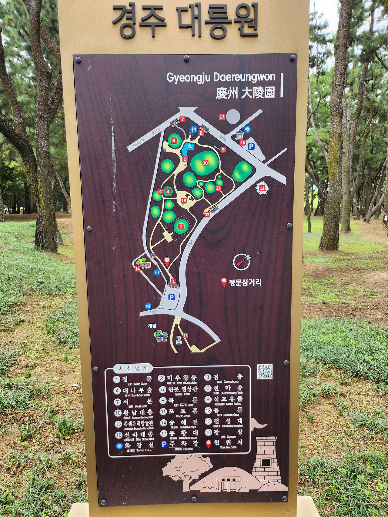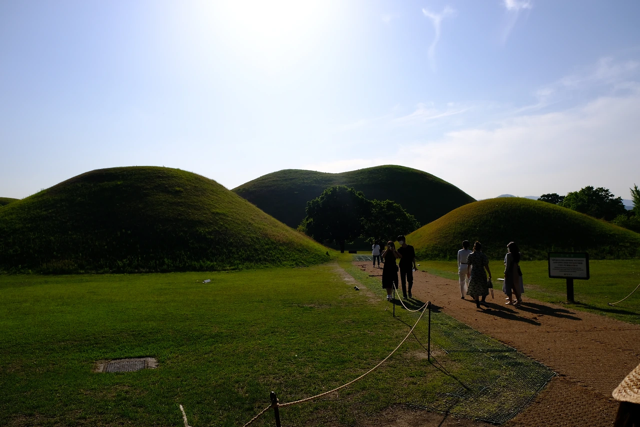 도로를 건너면 천마총, 황남대총, 미추왕릉 등 대형 고분들이 밀집해 있는 대릉원 핵심 구역이 나온다. 이곳은 부지가 넓고 고분 간의 간격도 비교적 가까워, 고분군을 따라 걸으며 관람하기에 좋다. 대릉원 내부에는 안내 지도가 마련되어 있지만, 스마트폰의 지도 앱을 활용하면 걸으면서 각 고분의 이름과 위치를 실시간으로 확인할 수 있어 매우 유용하다.