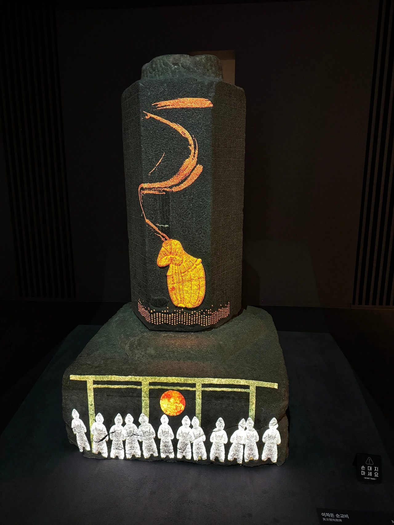 신라미술관에 들어서면 가장 먼저 이차돈 순교비가 눈에 띈다. 시간대별로 이차돈의 순교 장면이 비석 위에 영상으로 투사되어, 정적인 순교비가 화려하고 생동감이 넘친다.