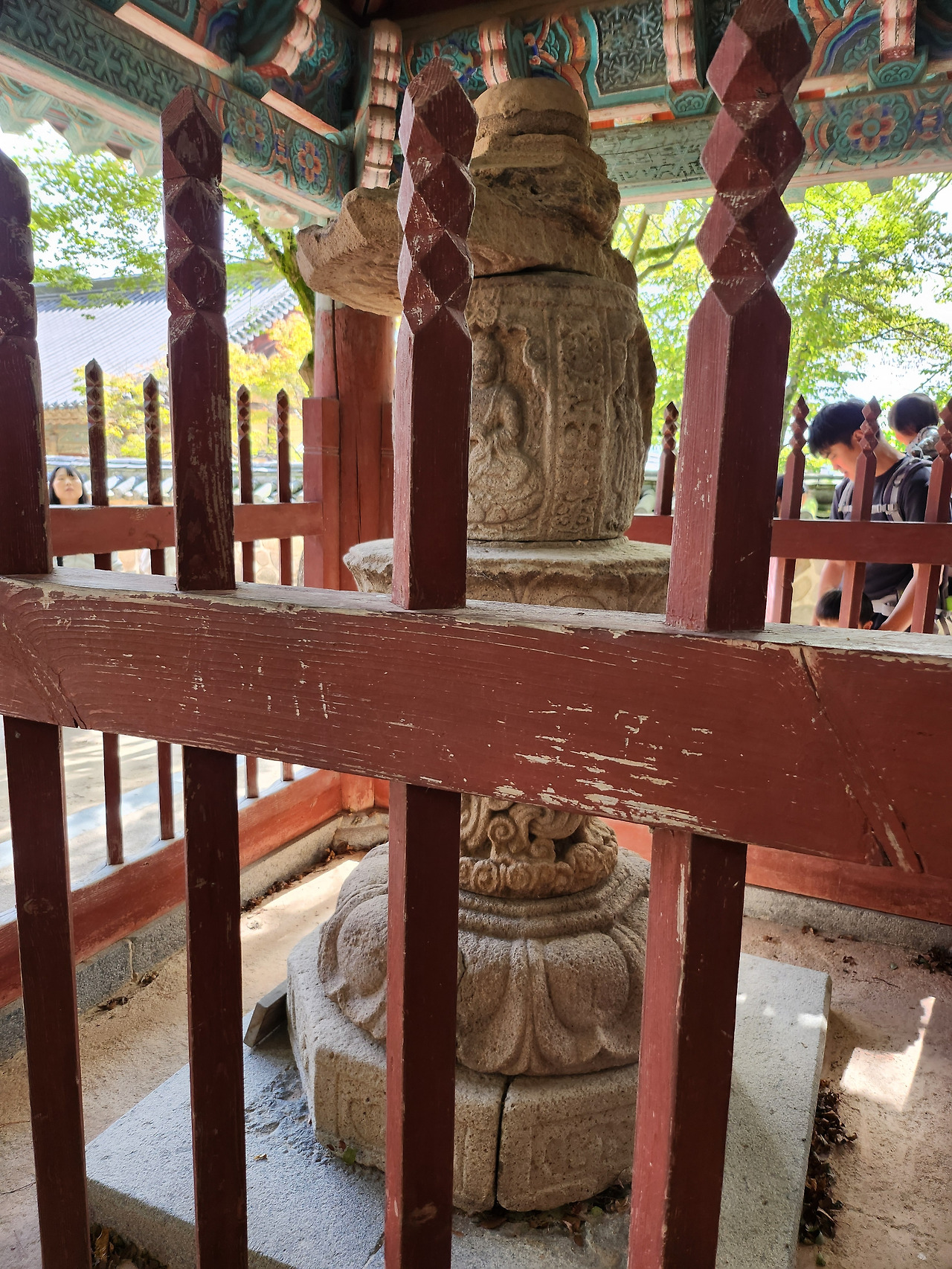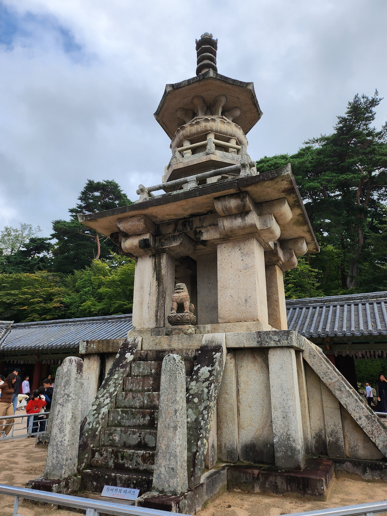 불국사 대웅전이 있는 마당에 들어서면 가장 먼저 눈에 띄는 것은 ‘다보탑’이다. 다보탑은 구조와 형태가 독특한 이형 석탑으로, 기단부에는 원래 네 개의 사자상이 배치되어 있었다. 그러나 일제강점기 때 도난당해, 현재는 코가 부러진 상태의 사자상 하나만 남아 있다. 탑 내부에는 원래 사리함도 있었을 것으로 보이지만, 역시 일제강점기 해체 수리 과정에서 사라졌다. 정황상 도난당한 것으로 추정된다.