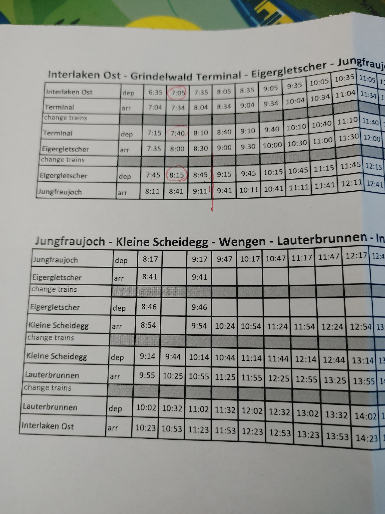 굿모닝 티켓을 사면 시간표를 준다. 아이거글레처에서 융프라우 가는 기차를 8:45까지 타야 한다.