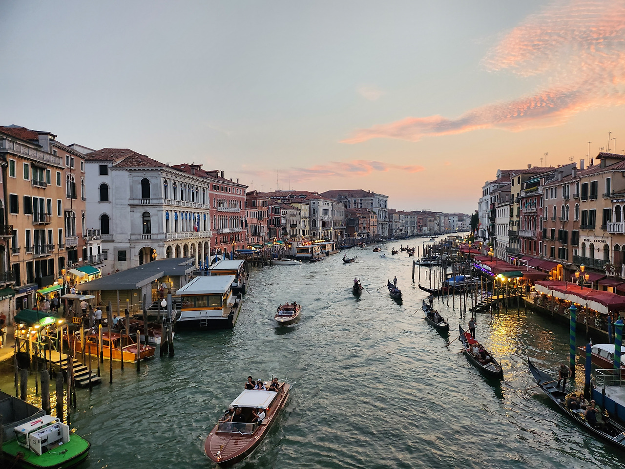 저녁 식사 후 리알토 다리에서 석양을 봤다. 18년 전 베네치아는 지저분하고 악취가 나서 하루만 머물고 빨리 다른 도시로 떠났었다. 코로나19로 관광객이 찾지 않는 동안 베네치아 물이 깨끗해졌다는 기사를 봤다. 물 색깔이 예전과 다르다. 악취도 나지 않았다. 다시 온 베네치아는 18세기 카날레토 풍경화처럼 아름다웠다.
