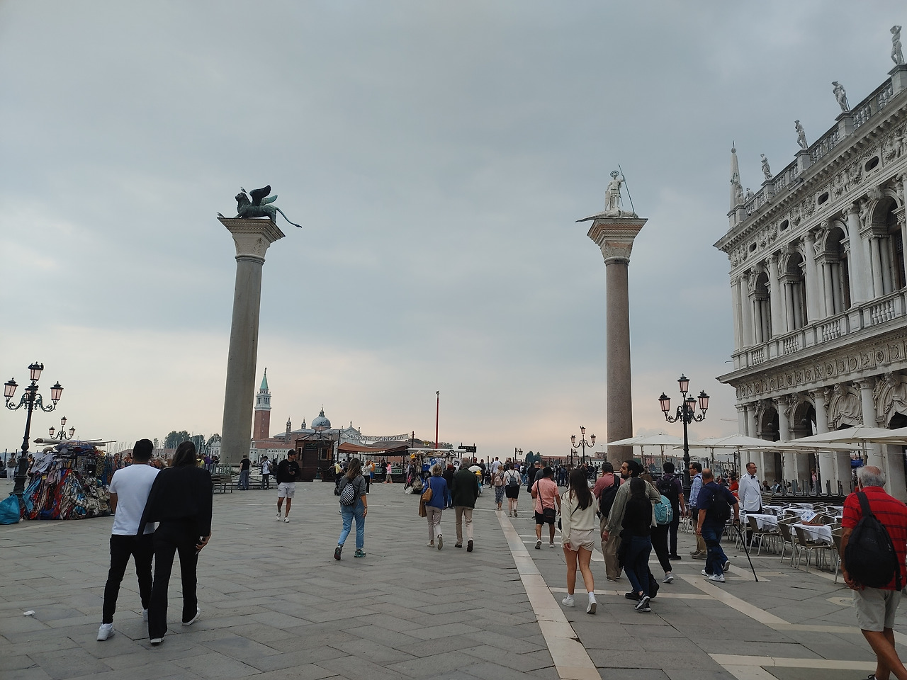 광장 한쪽에는 마르코의 상징인 '날개 달린 사자' 동상이 있다. 베네치아 공화국의 상징이기도 하다. 사자 머리 위에 앉은 비둘기까지 하나의 조형물처럼 보인다.