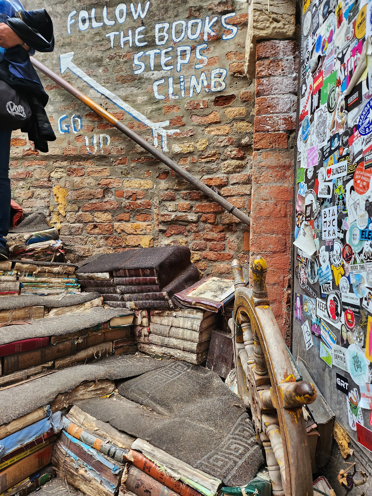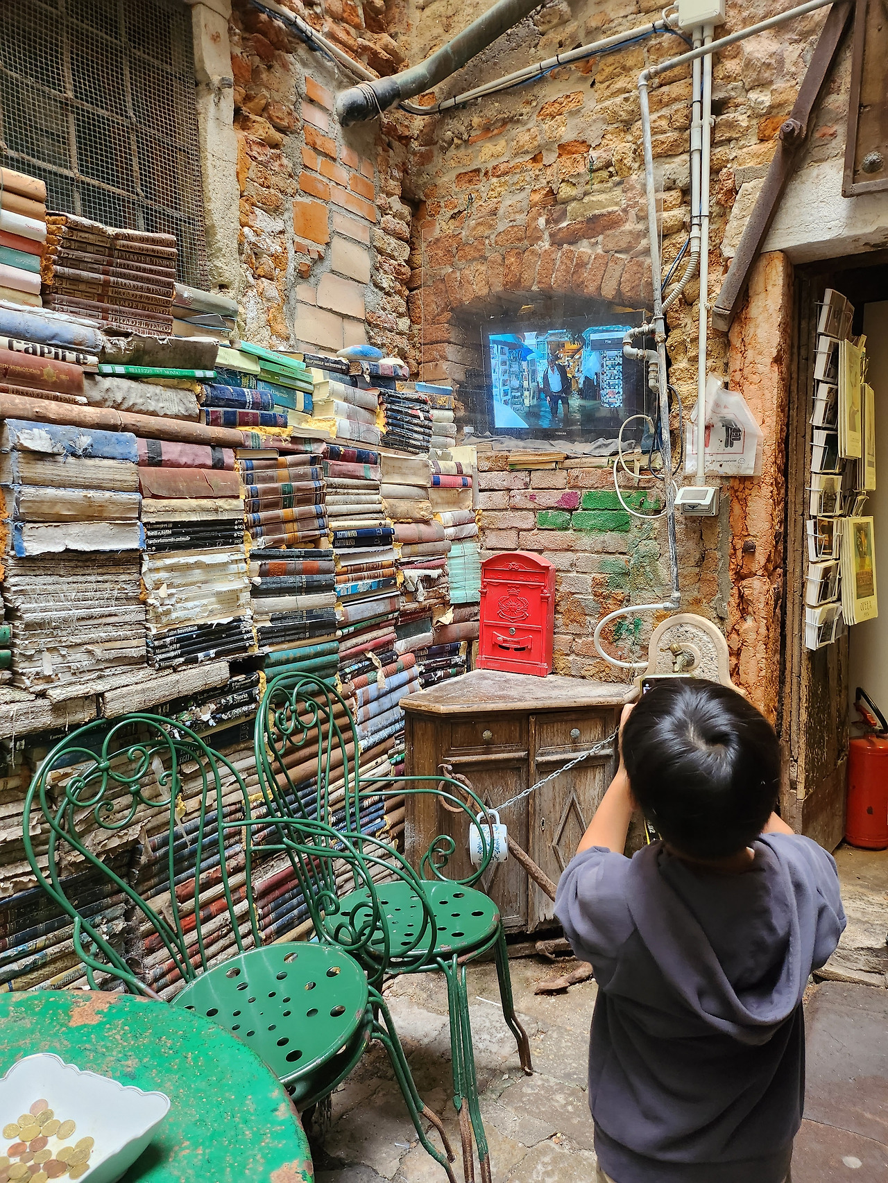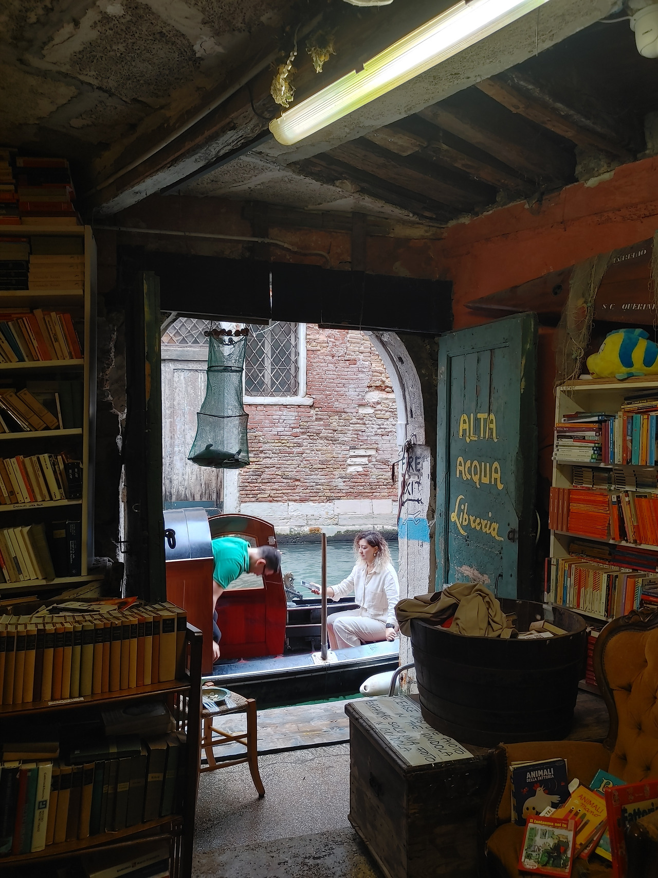 서점 한구석에 수로 방향으로 문이 열려있고 사용하지 않는 곤돌라 하나가 묶여 있다. 책 계단 포토존은 줄이 길었지만 이곳은 별로 알려지지 않았는지 사람이 없었다. 우리 가족도 이곳에서 사진을 찍었다.