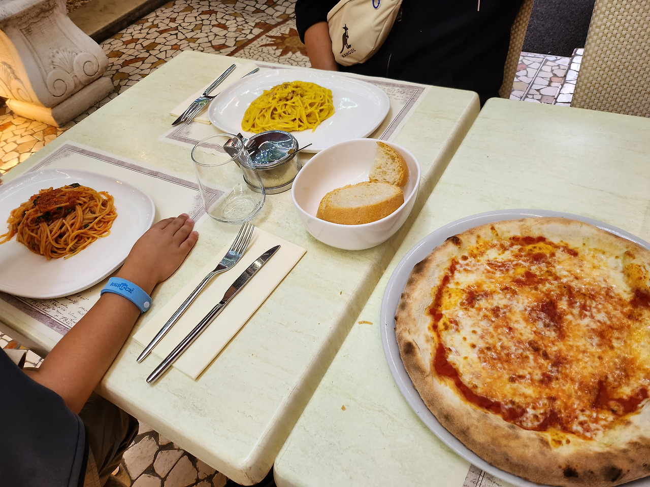 토마토 파스타, 까르보나라, 마르게리타 피자를 주문했다. 한국에서 흔히 먹는 까르보나라는 크림 파스타에 가깝지만, 이탈리아 정통 까르보나라는 계란을 주 재료로 사용한다고 한다. 남편이 호기심에 몇 번 만들어 보려고 시도했지만, 매번 실패했다. 도대체 계란으로 어떻게 파스타 맛을 낼 수 있는지 궁금했다. 이 식당에서 나온 까르보나라는 색깔부터 계란 노른자의 밝은 노란색이었다. 진한 계란 맛과 고소함을 느낄 수 있었다. 우리는 정통 까르보나라 맛이라며 감탄했다. 아이도 크림 파스타보다 훨씬 더 맛있다고 했다.