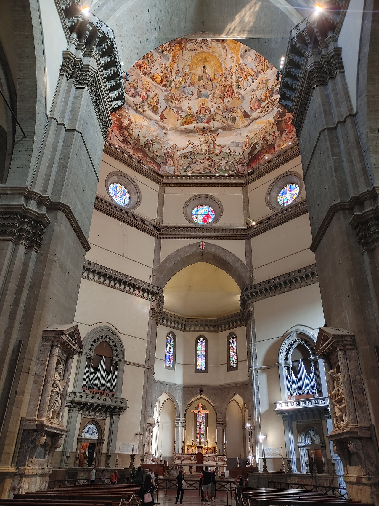 르네상스 성당은 바로크 성당과 달리 화려하지 않다. 대신, 소박하고 우아한 아름다움이 있다. 돔 내부에는 바사리와 제자들이 그린 천장화가 있었다. 세상에서 가장 큰 천장화라는데 높이가 높아서 그런지 그렇게 큰 지는 잘 모르겠다. 바사리는 르네상스 화가들의 전기를 쓴 미술사가로만 기억하고 있어서, 바사리가 그린 그림이라는 점이 흥미로웠다. 충분히 훌륭한 천장화이지만 르네상스 천재 화가들에 비할 바는 아니다. 바사리 스스로가 화가이기 때문에 르네상스 화가들의 위대함을 더 잘 알지 않았을까.