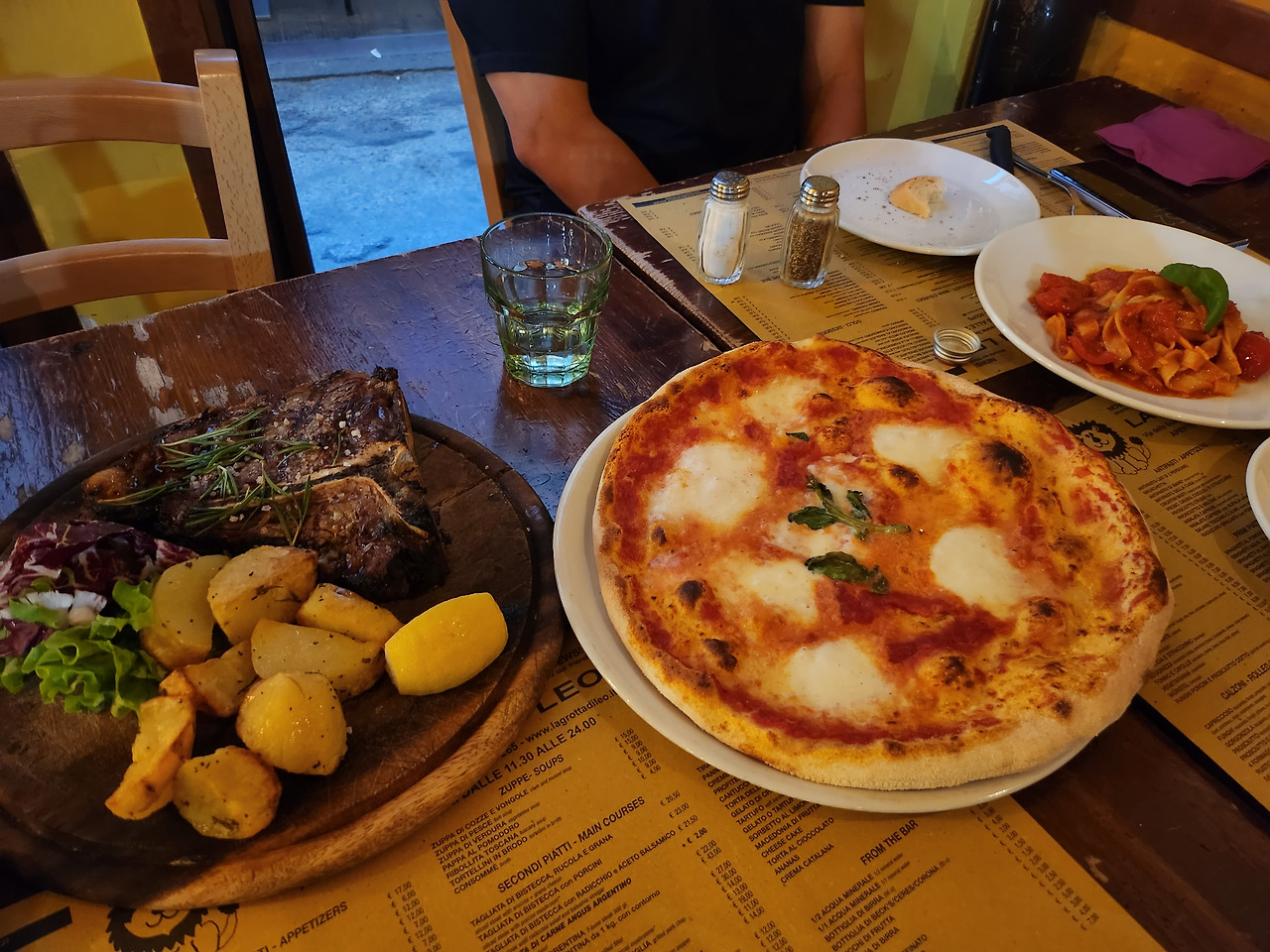 드디어 저녁을 먹으러 갔다. 너무 배가 고파 맛집을 찾아갈 기력도 없고 숙소 앞 괜찮아 보이는 식당을 갔다. 피렌체는 티본스테이크가 유명한데, 과거 가죽 공방이 많았기 때문에 막 가죽을 벗긴 고기를 스테이크로 먹었다고 한다. 보통 1kg 이상씩 판매한다. 티본스테이크 1kg는 가격도 비싸지만 양이 많아서 먹다가 질릴 거 같았다. 피자, 파스타를 함께 먹고 싶기도 하고. 이 식당을 선택한 이유는 스테이크 일 인분 0.5kg 메뉴가 있기 때문이었다. 흔히 이탈리아 레스토랑에 가서 주문하는 방식대로 스테이크, 피자, 파스타를 주문했다. 이탈리아에서 피자를 주문하면 매번 컷팅이 안되어 나온다. 옆 테이블을 보니 한 커플이 일인 일피자 식사 중이었다. 그래서 피자를 잘라주지 않나 보다. 배가 고파 그런지 모든 음식이 맛있었다.