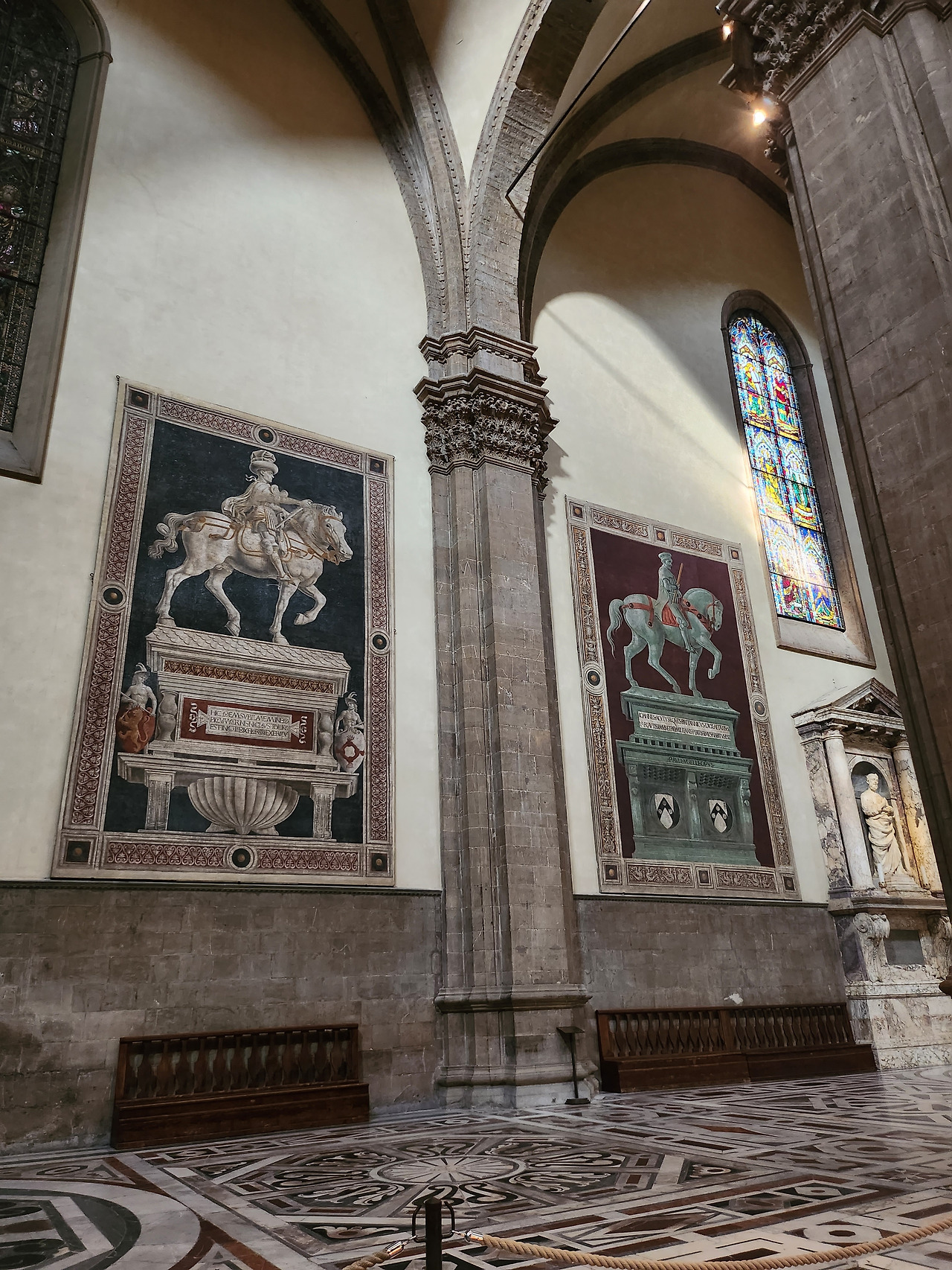 대성당 내부에 초기 르네상스 화가인 우첼로와 카스타뇨의 기마상이 있다. 청동색이 우첼로, 대리석 색이 카스타뇨 그림이다.