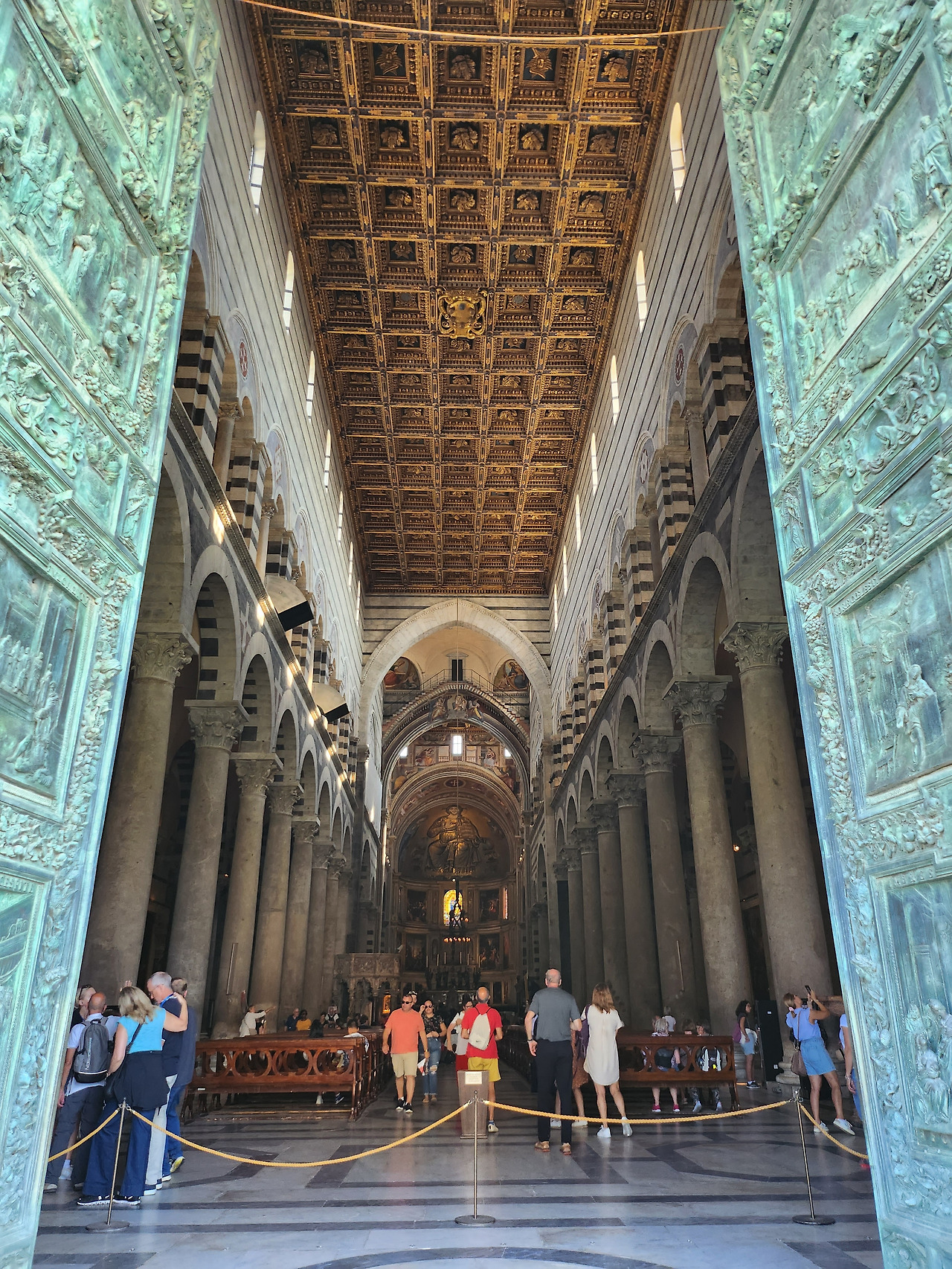 성당 내부를 들어가고 싶었지만, 사탑이나 박물관 티켓을 구입해야만 입장이 가능했다. 성당만 들어가는 입장권은 따로 판매하지 않았다. 예약제로 바뀌면서 개별 티켓보다 통합권을 위주로 판매하는 것 같다. 문을 활짝 열어두어 아쉬운 대로 내부를 볼 수 있었다. 피사 성당은 대표적인 로마네스크 성당으로 초기 바실리카 양식의 평평한 천장이 특징이다. 성당, 세례당, 종탑 3개의 건물로 구성된 것이 전통적인 성당건축방식인데, 그 전통이 시작된 곳이 피사 대성당이다.