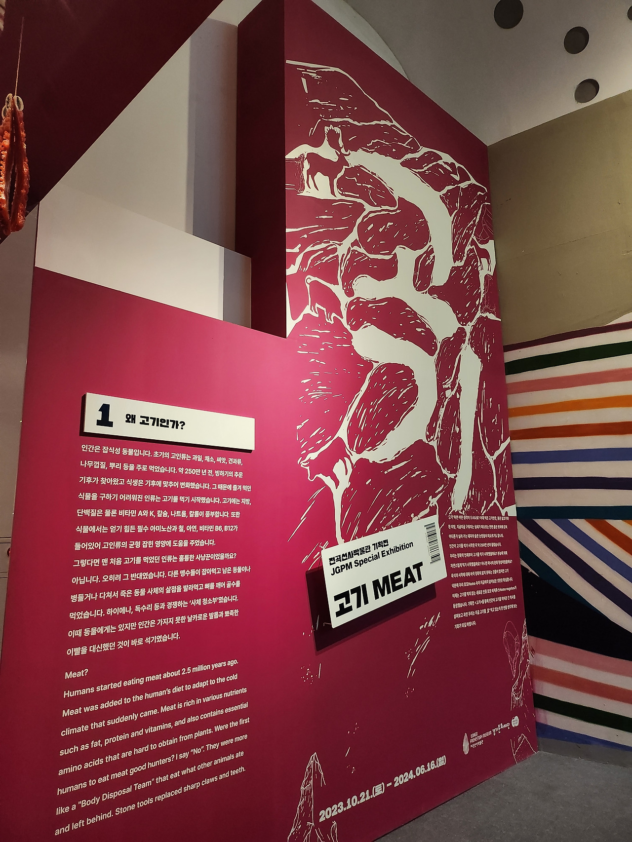 이번 기획전시는 흥미롭게도 주제가 '고기'이다. 최초의 인류는 과일, 채소를 채집해서 먹었는데, 빙하기가 찾아오면서 지구 환경이 변하고 식물을 구하기 힘들어지자 고기를 먹기 시작했다. 석기는 고기를 먹기 위해 꼭 필요한 도구였다. 동물을 사냥할 때뿐 아니라 인간에게는 없는 날카로운 이빨과 발톱을 대신해서 가죽을 벗기고 고기를 자를 수 있었다. 인류는 고기를 먹기 시작하면서 석기를 제작하게 되었고 도구를 사용함으로 두뇌가 발달하게 되었다.