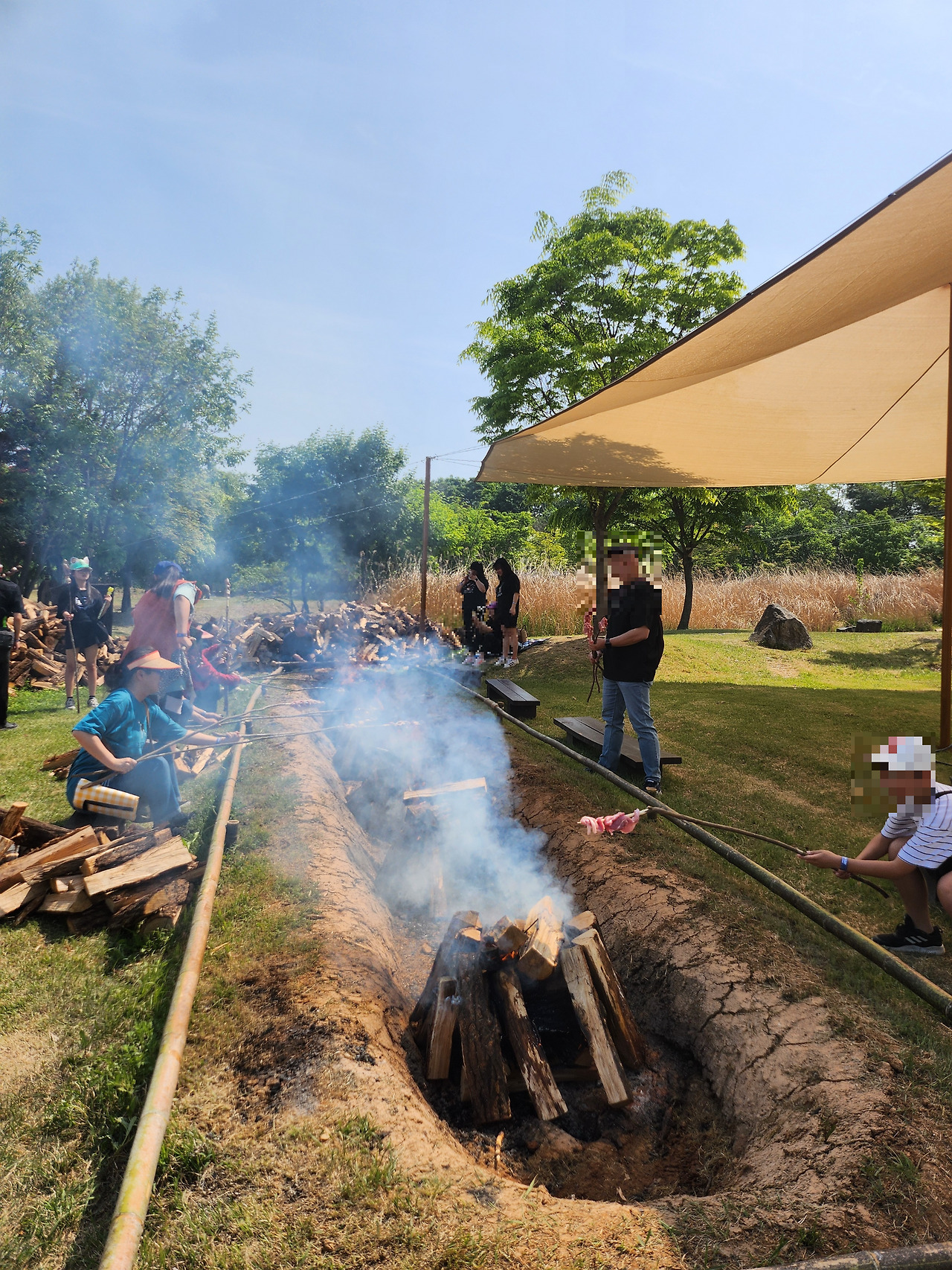 구석기 축제 인기 체험인 '구석기 바비큐'이다. 약 1m 나무 막대에 돼지고기를 꽨 꼬치를 모닥불에 직접 구워 먹는다. 5월 햇살은 아침부터 뜨겁고 모닥불은 더 뜨거웠다. 얼굴이 새빨갛게 달아오르고 연기로 목도 따가웠다. 아이는 긴 나무 막대가 무겁고 불이 뜨거워 힘들어했지만 재미있다고 끝까지 구웠다. 나무 가지에 달린 고기를 먹으려면 얼굴에 숯을 묻혀가며 뜯어먹어야 하는데 그것도 색다른 경험이었다. 직화구이 고기가 정말 맛있었다. 구석기와는 어울리지 않지만 떡도 구워 먹을 수 있다.