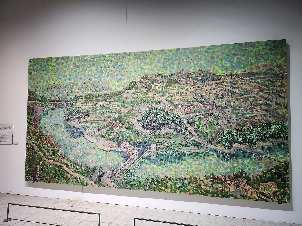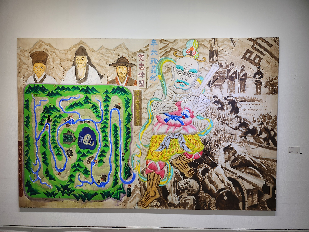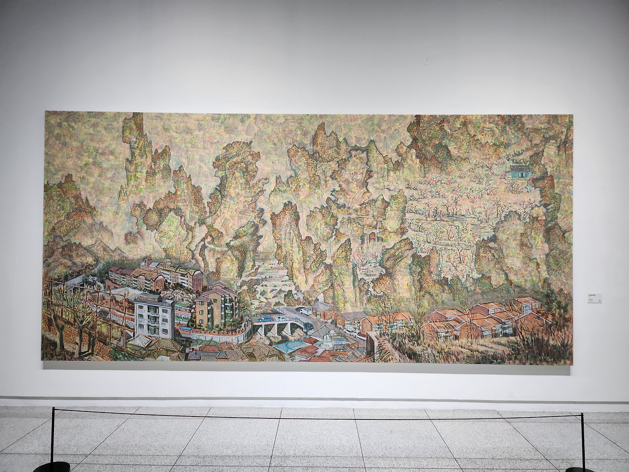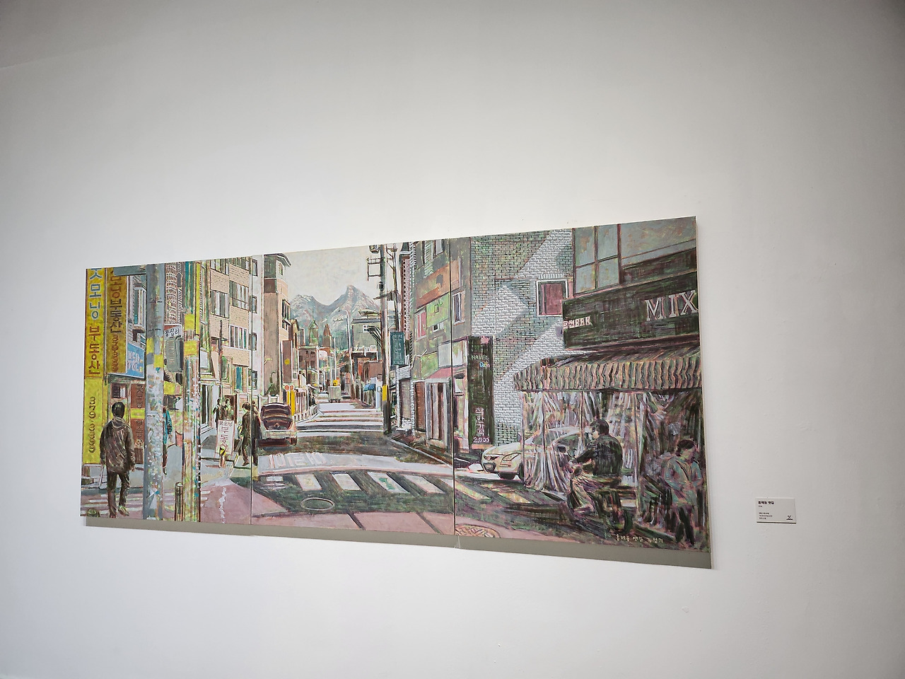 유 몽유도원도_2016_캔버스에 유채_209.5×444cm_작가 소장'유 몽유도원도' 작품 앞에서 한 동안 머물렀다. 몽유도원도와 현재 서울 모습이 함께 그려진 초현실적인 풍경이 인상적이었다. 꿈속 비현실 공간과 실재 공간, 조선 초기와 현대 대한민국의 각기 다른 시대가 한 화면에 자연스럽게 어우러져 독특한 분위기를 자아낸다.