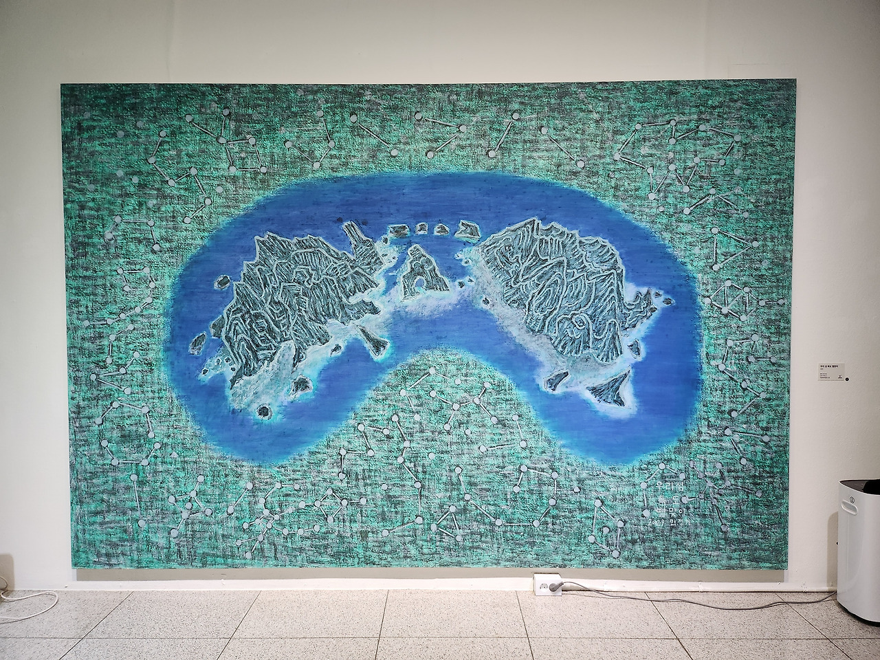우리 섬 독도 별맞이_2002_캔버스에 유채_225×340cm_국립현대미술관 소장파란 독도 그림이 정말 아름다웠다. 광각렌즈로 찍은 듯한 독도를 둘러싼 배경은 별자리가 있는 밤하늘 같기도 하고 동해의 망망대해 같기도 하다. 독도와 별을 연결시킨 이미지가 색다르다. 우리 섬 독도 별맞이.라는 제목도 어감이 참 예쁘다. 외롭고 아름다운 섬이 느껴진다.