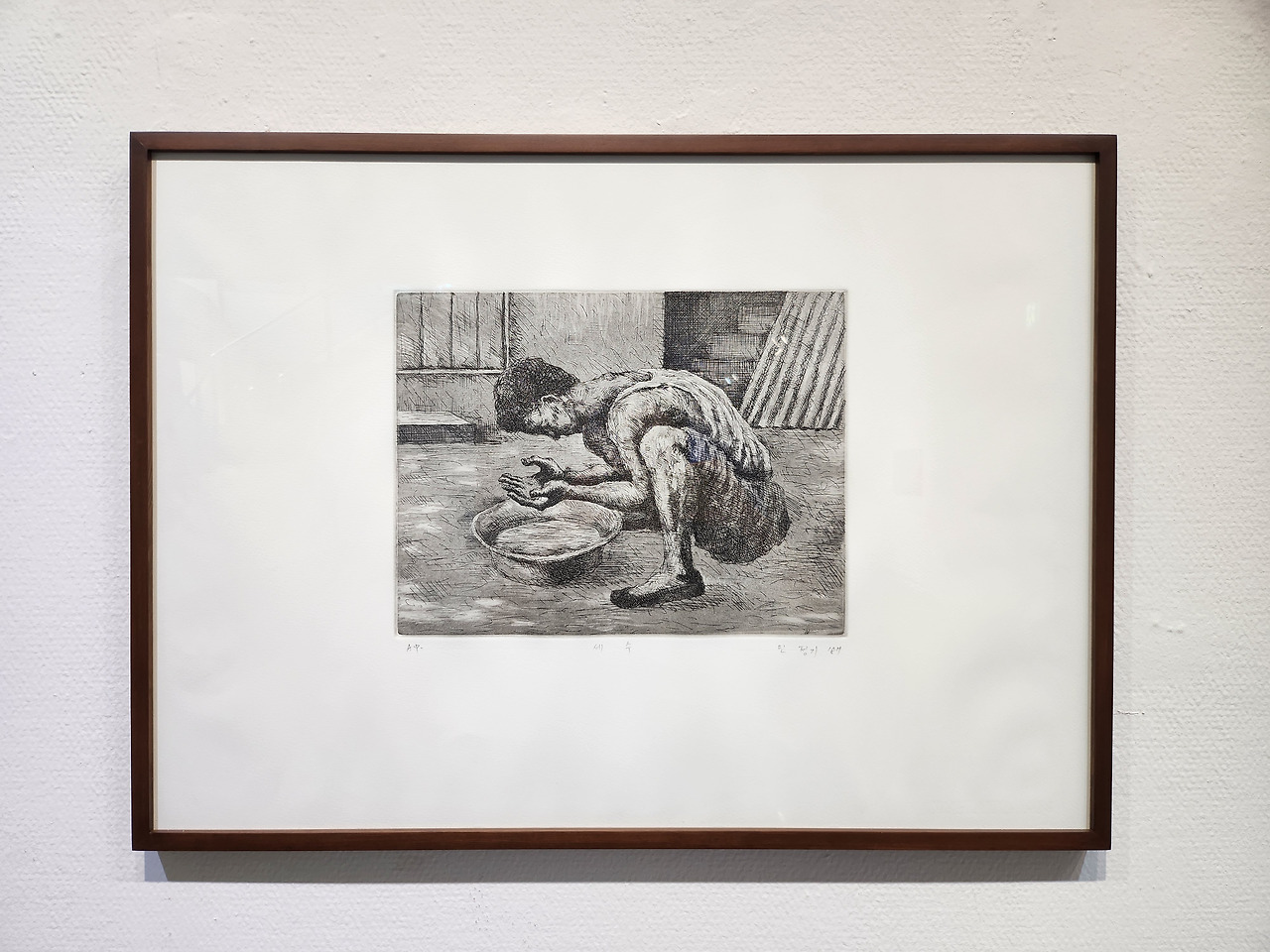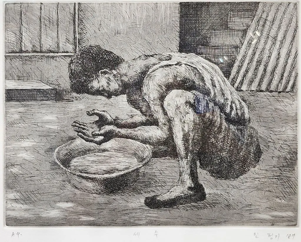 민정기 '세수'전시된 판화는 모두 'A.P.'였다. 판화는 회화와 달리 여러 장을 찍어낼 수 있기 때문에 에디션 넘버를 연필로 기록한다. A.P. 는 판매용이 아니라 작가 소장품이라는 뜻이다.