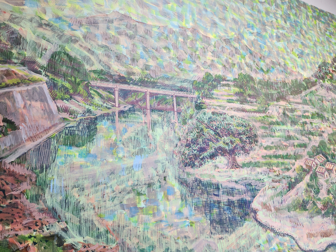 작가의 최근 그림 양식이다. 사실적인 풍경 같지만 가까이에서 보면 가로 세로로 반복적으로 그은 추상적인 빗살선이 보인다.