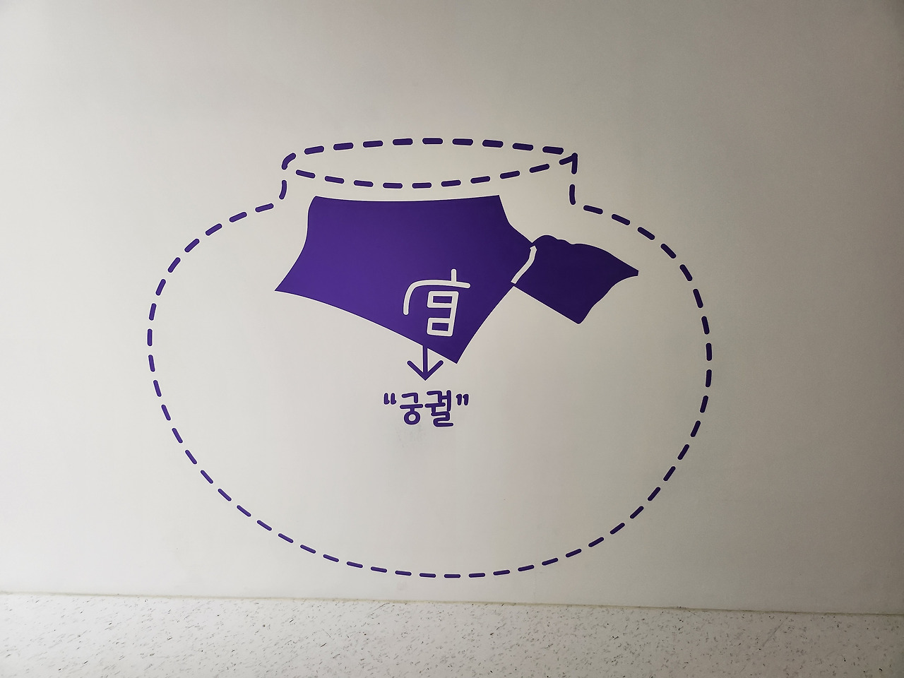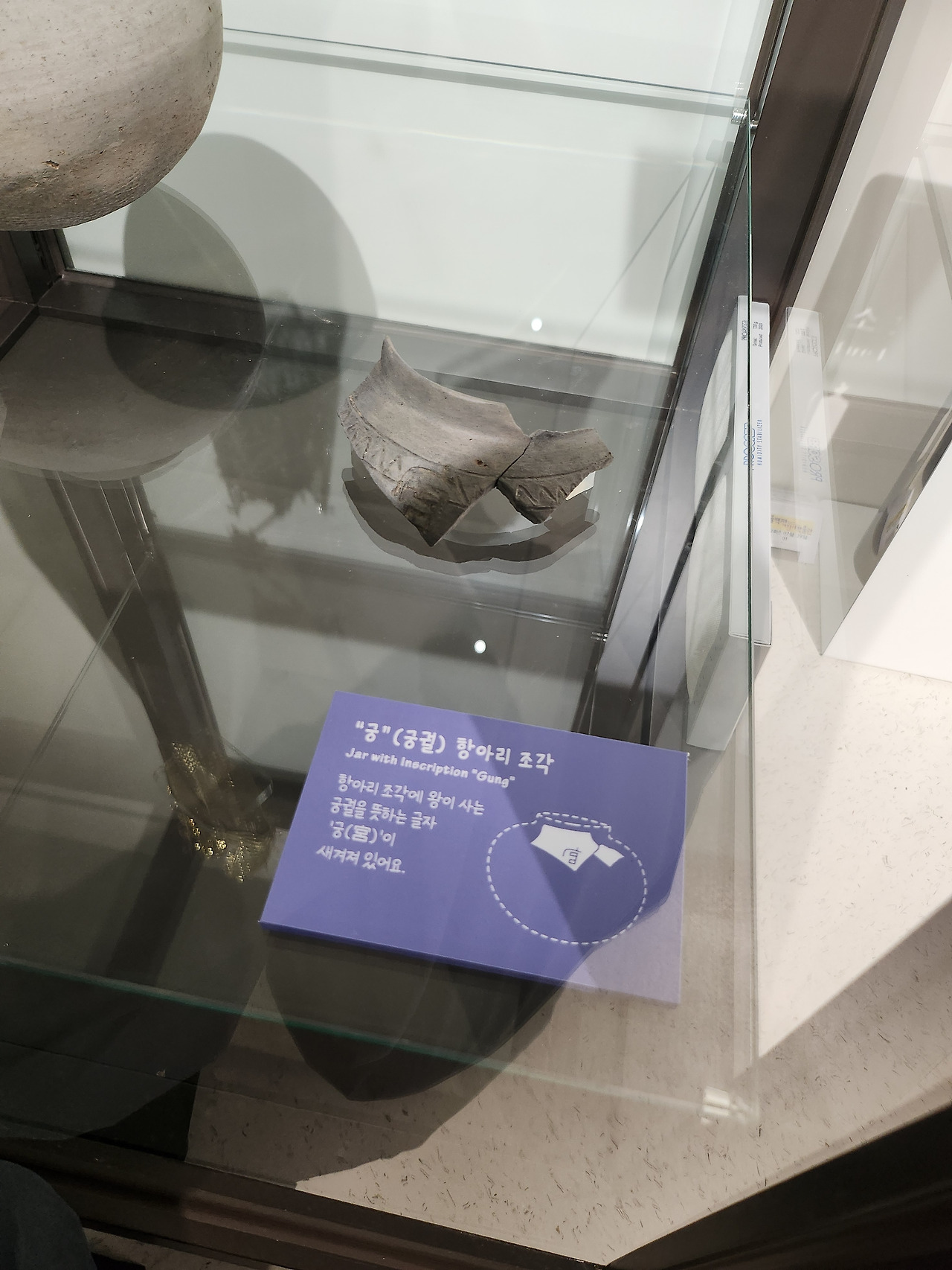'궁' 글자가 새겨진 항아리에 대한 설명이다. 이 항아리 조각의 발굴로 이곳이 백제의 왕궁터였다는 것이 밝혀졌다고 한다. 백제 어린이 박물관에 전시된 유물은 복제품이고, 진품은 한성백제박물관에 전시되어 있다.