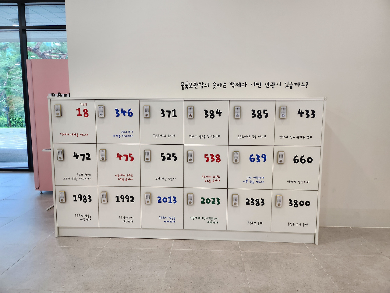 물품보관함의 숫자는 백제와 어떤 연관이 있을까? 물품보관함도 전시의 일종이다. 보통 화장실 옆 후미진 곳에 있는 물품보관함이 로비 중심에 있다. 물품보관함 번호가 백제와 관련된 숫자로 되어있다. 특히 중요한 사건은 빨간색으로 표시했다. 기원전 18, 백제가 나라를 세우다. 475, 서울에서 공주로 수도를 옮기다. 538, 공주에서 부여로 수도를 옮기다. 맡길 짐은 없었지만 아이디어가 너무 좋아 사진을 찍었다.
