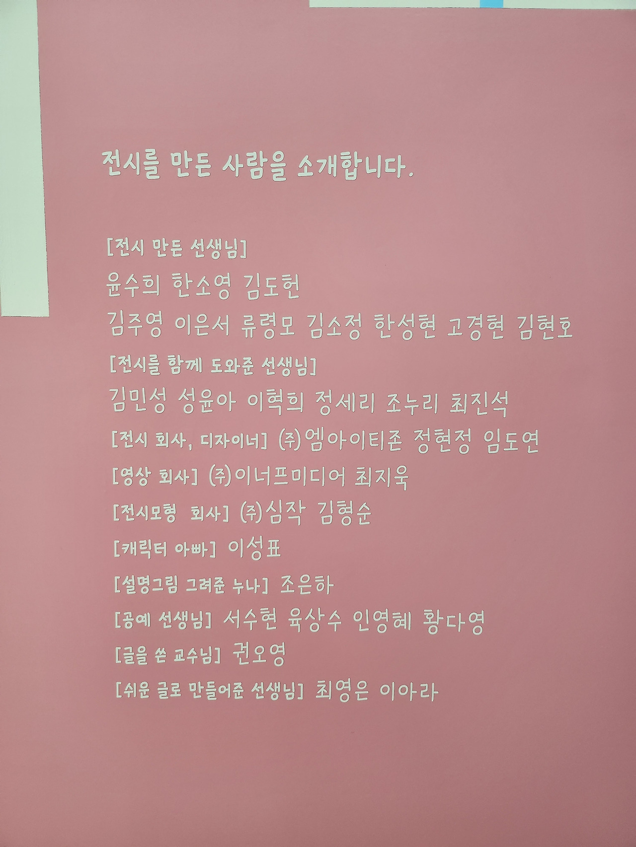 박물관을 방문할 때마다 어느 회사에서 전시 인테리어를 한 것인지 궁금해했다. 보통 준공한 건축회사는 나오지만 전시를 한 업체는 잘 표기하지 않는다. 전시를 만든 사람들을 소개한 코너가 마음에 들었다. 아이들에게 이 박물관이 이렇게 많은 사람들이 협력해서 만들어진 것이라는 것을 알려주는 것도 교육적으로 좋다고 생각한다.