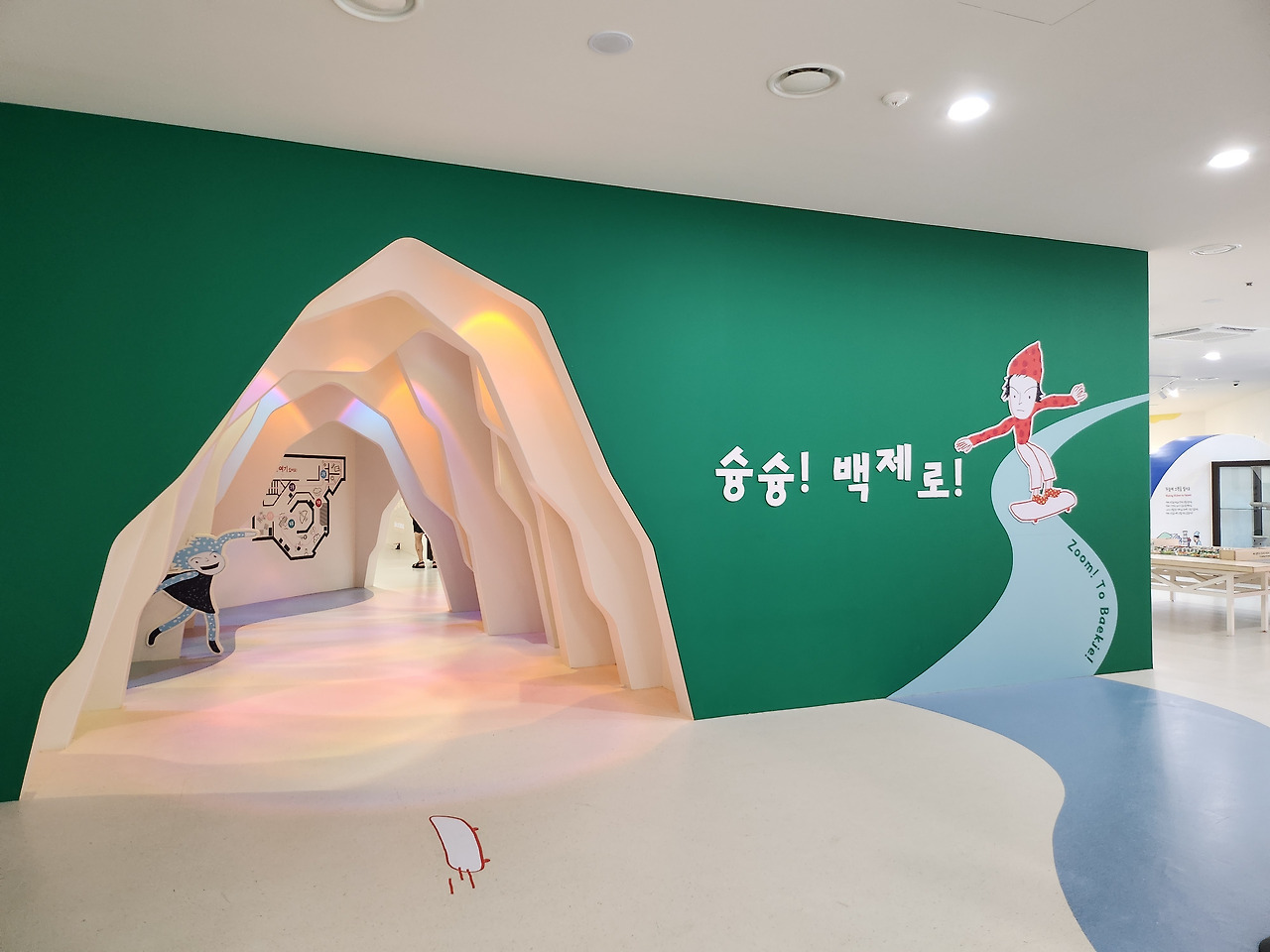 슝슝! 백제로! 전시 시작 게이트의 짙은 녹색과 핑크빛 도는 회색톤 색상 대비가 상큼하다. 겹겹이 레이어로 연출한 터널은 동굴 속을 지나 옛 백제로 가는 시간여행을 표현한 것 같다.