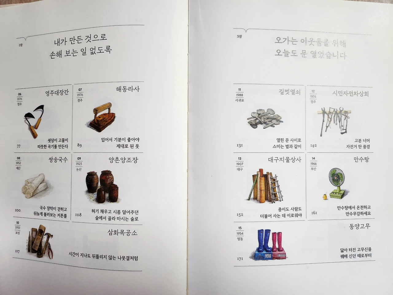'또 올게요. 오래가게' 목차각 가게 물건을 그린 일러스트로 목차마저 감성적이다.