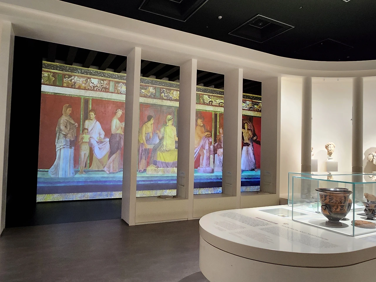 한쪽 벽면에는 폼페이 벽화 몇 장을 영상으로 보여주고 있다. AI로 구현하여 인물들이 움직인다.