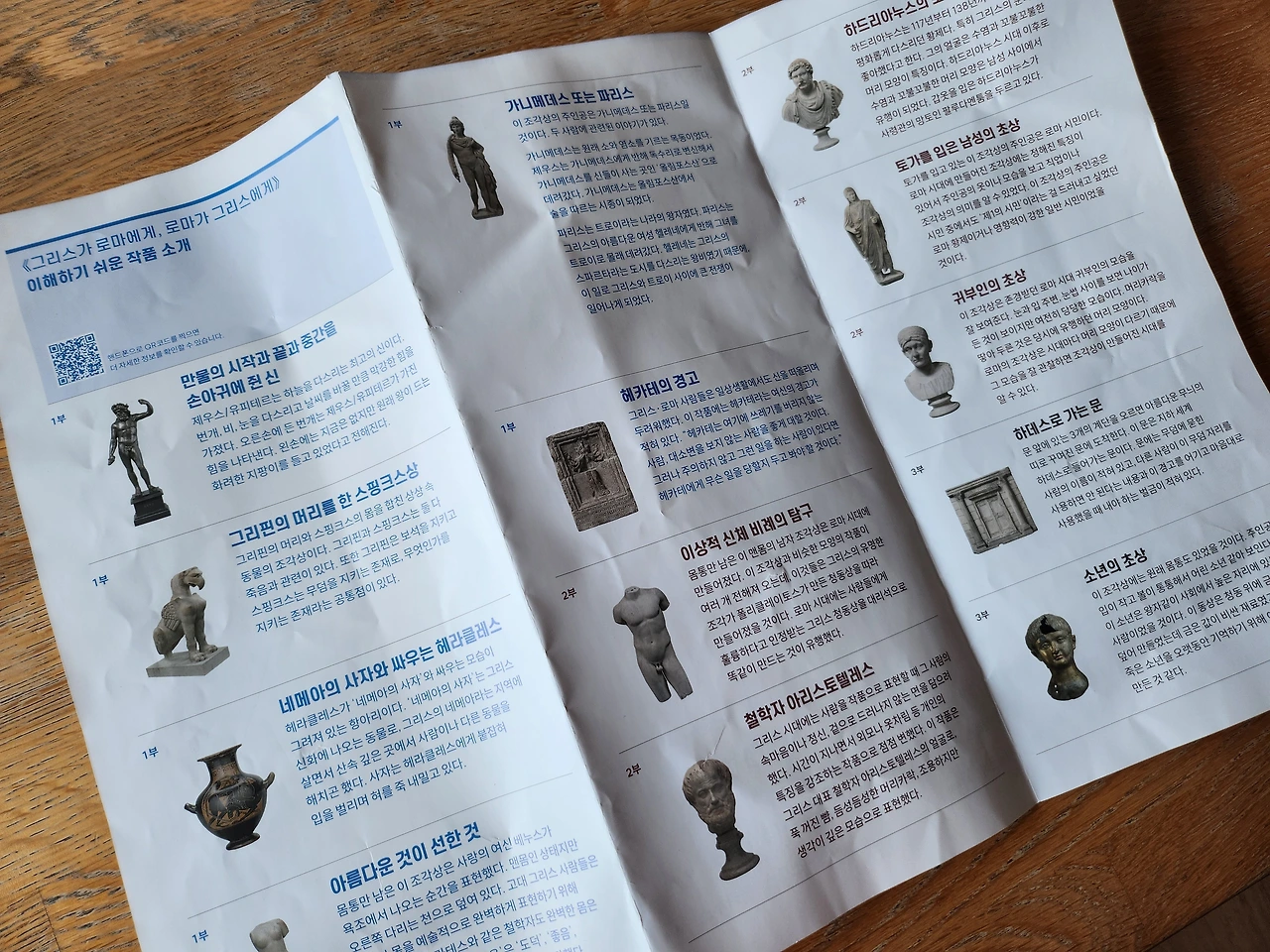 전시에 대해 상세한 설명이 담긴 브로셔가 배치되어 있었다. 삼등분으로 나누어 접으면 딱 좋은 사이즈이다. 아들은 그리스로마 신화를 무척 좋아하기 때문에 브로셔만 가지고 혼자서 잘 감상했다.