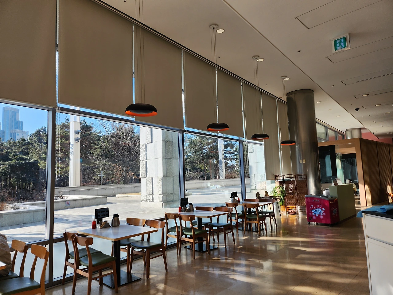 아침 일찍 서둘러 나와서 아침 식사도 못했고, 피곤했다. 경천사탑 뒤쪽 식당에서 이른 점심을 먹었다. 이날 한파로 몹시 추웠지만 내부에 식당이 있어 참 좋다. 창 밖으로 야외 전시가 보이고, 햇살이 따뜻하다.