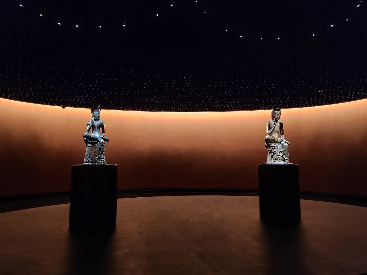 사유의 방은 넓은 공간에 반가사유상 두 개만 놓인 미니멀한 전시이다. 이 연출방식이 참 마음에 든다. 이 공간에 들어오면 저도 모르게 숙연해지는데, '사유의 방'이라는 이름과 너무 잘 어울린다. 왼쪽 화려한 관을 쓴 상은 금동일월식삼산관미륵반가상(6세기말), 오른쪽 간결한 관을 쓴 상은 금동삼산관미륵반가상(7세기 초)이다. 오른쪽 반가사유상은 일본의 국보 1호 '목조미륵반가사유상'과 형태가 유사하여 일본에 미친 영향을 짐작할 수 있다.