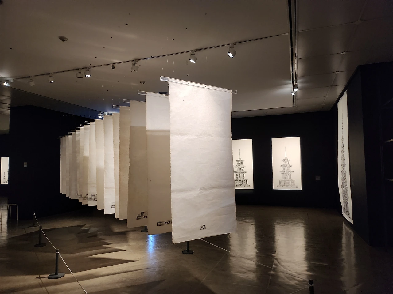 먹과 탑의 화가라고 불리는 박진우 작가 전시이다. 작업 방식이 특이했다. 먹을 탁본해서 탑 형태를 그린다. 석재를 하나하나 쌓아 만드는 탑 결구 양식과 같다.