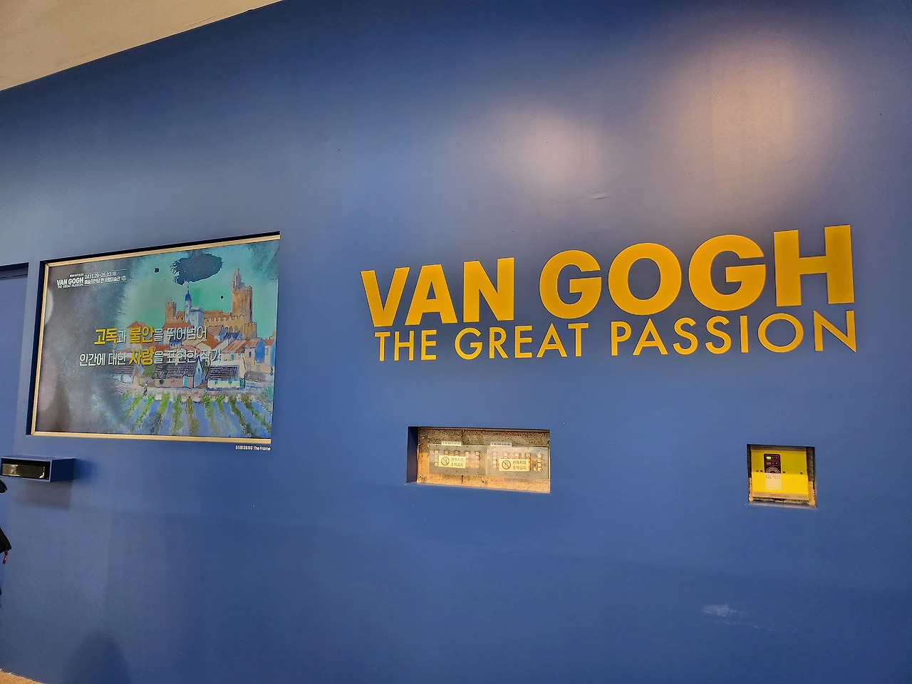 전시 공간은 전체적으로 파란색이었다. 고흐의 노란색의 보색이라 선택한 것인지? 그리고 작품 벽 앞으로 낮은 턱이 있어서 차단선 없이도 자연스럽게 작품 가까이 갈 수 없게 되어 있었다. 사진 촬영은 금지였다. 이런 경우 포토존을 만들어 주던데 포토존이 없는 것은 좀 아쉬웠다.