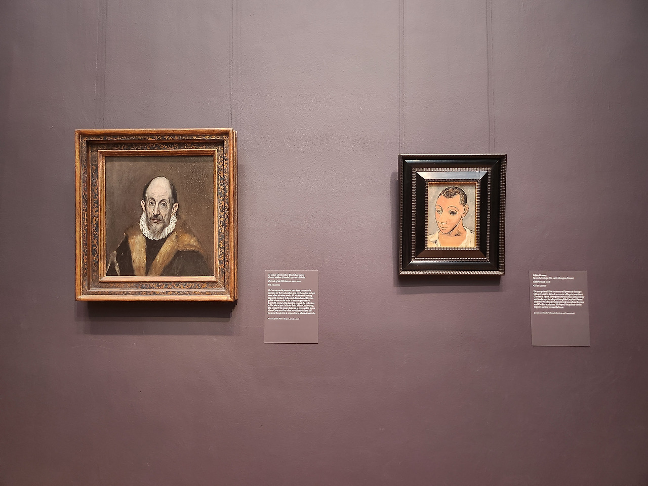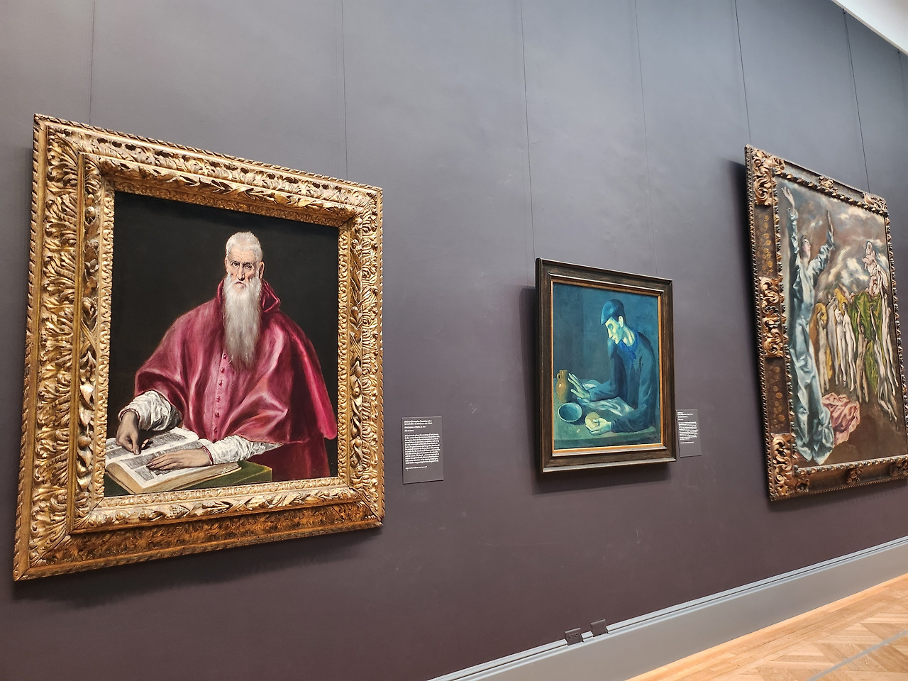 엘 그레코와 피카소. 나란히 걸린 작품 속에서 인물을 표현하는 방식이 유사함을 볼 수 있다. 뼈만 남은 듯 앙상하고 길게 늘어난 팔다리, 창백하고 우울한 푸른 톤, 신비롭고 영적인 분위기까지. 스페인 태생인 피카소는 마드리드의 프라도 미술관에서 엘 크레코에 매료되었다고 한다. 엘 그레코는 스페인에서 활동한 그리스 출신 화가로, 엘 그레코(El Greco)도 본명이 아니라 그리스 사람이라는 뜻이다.