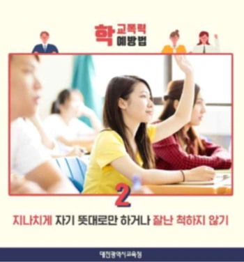 수업 시간에 손을 번쩍 들고 있는 여학생의 사진이다. 사진만 보면 대체로 손을 번쩍 들고 발표를 잘 하지 못하는 한국 학생들이 많으니, '발표를 적극적으로 합시다'라고 장려하는 캠페인의 사진처럼 보인다. 그러나, 사진 위, 아래에 설명되어 있는 문구를 보면 고개가 갸우뚱해진다. '학교 폭력 예방법'과 '지나치게 자기 뜻대로만 하지 말고 잘난 척하지 않기'라는 설명을 보고 나니 포스터가 전달하려는 메시지가 이해되기 시작했다.