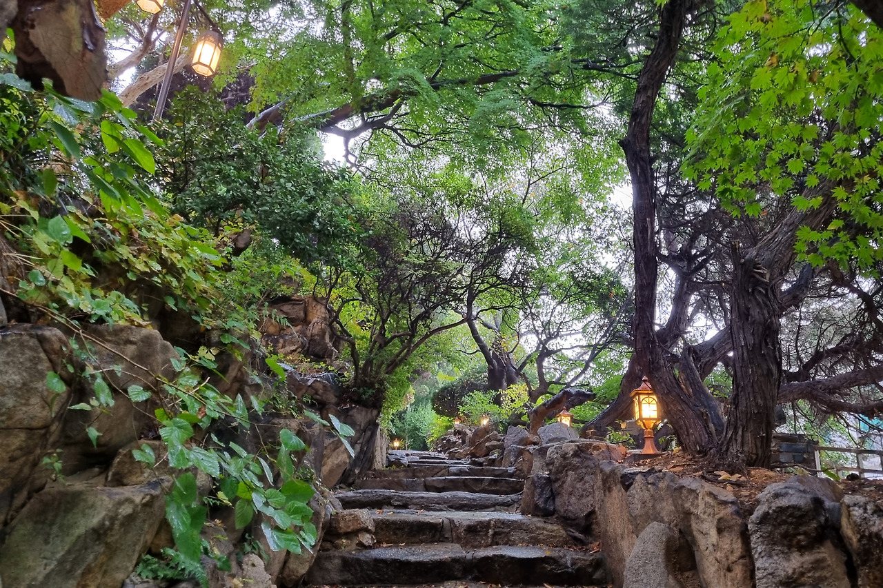 대문을 들어서니 산 중턱 그늘진 곳에서 지나가는 이에 쉴 자리 하나 내주었을 법한, 바위와 조각들이 옹벽과 돌계단으로 쓰임새가 바뀌어 이곳에 눌러앉아 있다. 돌계단 위는 푸른 잎이 떨어져 나간 한겨울에도 햇볕을 가릴듯한 빽빽한 잔가지가 아치형 터널을 만든다. 가지 끝에 달린 진녹색 잎새가 빗물의 무게를 견디지 못하고 물방울을 툭툭 떨어낸다. 우산 위로 느껴지는 무게가 묵직하다. 이런 무게감은 옹벽 한편이 아름드리나무뿌리에 밀려 기울어져 있는 것에서도 풍긴다. 세월의 무게, 인고의 무게다.