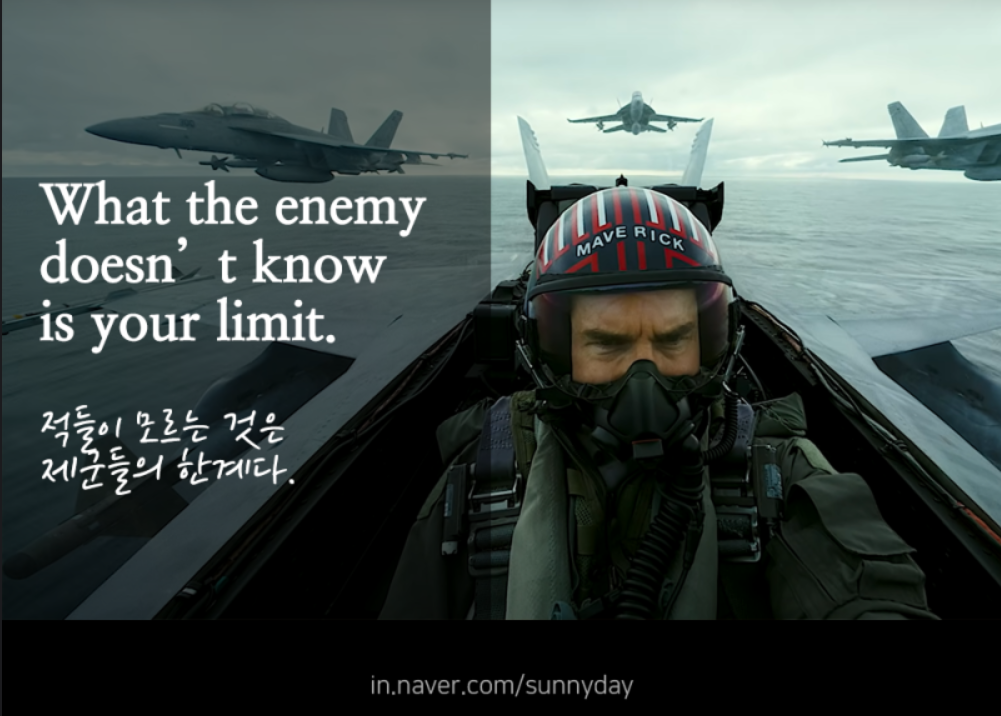 탑건 명대사 -출저 네이버블로그 sunnyday-36년 만에 후속작을 발표한 탑건:매버릭은 다른 영화들과 다르게 23개월간 OTT 개봉을 거부하며 영화관 상영을 고집했다. 그 결과 약 14억 달러, 한국에서만 약 8백만 명을 (2022년 10월 3일 기준) 동원하며 코로나로 변한 영화계의 흐름을 역행하며 말 그대로 매버릭의 (닉값을 했다) 의미를 그대로 보여줬다. 또한 이 영화는 전쟁에 관한 묘사를 의도적으로 피했다고 한다. 적국을 특정하지 않았을 뿐만 아니라, 묘사 역시 최대한으로 줄였다. 이 영화를 위해 배우들은 모두 직접 전투기에 탑승하여 연기를 하였고, 3개월에 걸친 혹독한 항공 훈련프로그램을 소화했다고 한다. 이러한 영화 내외적인 요소들은 대중성과 흥행을 모두 잡았고, 전편을 뛰어넘는 속편이라는 이야기가 나올 만큼 전작과의 연결성 역시 훌륭했다. 영화를 보고 평가가 다를 수 있겠지만, 대중적으로 전투기 액션에 대해서는 긍정적인 평가가 일색인점은 영화를 봐야하는 포인트 중에 하나였다. 여기에 포인트를 한가지 더하자면 액션뿐만 아니라 극의 배역들이 매우 매력적이라고 생각한다. 자신의 신념과 행동들 또 그 과정에서 성장이 있는 어떻게 보면 클리셰 덩어리인 스토리라인과 주인공들이었지만, 아름다운 미래를 그리고 합력해서 선을 이루는 결말은 마음을 따뜻하게 만들어 주는 것 같다. 사람들은 평가와 자신들만의 결론을 내린다. 각자의 삶에서 자신의 콜사인은 무엇일지 생각해보는 것도 영화를 다 본 후 즐길 수 있는 하나의 모습이지 않을까 싶다. 여담이지만 내 콜사인은 올라프였다.