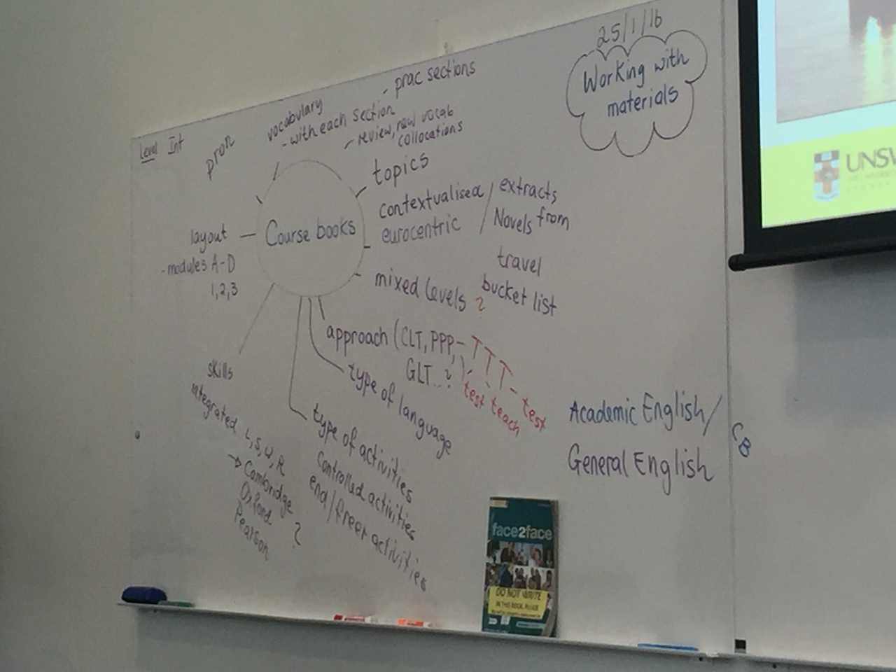 17명의 교사들은 각 6단계의 레벨별로 참관을 했고 중등교사이면서 월등히 영어 실력이 높으셨던 한 분만 비즈니스 영어과정을 참관하셨고 나머지는 모두 General English Courses 참관했다. 내가 참관한 레벨은 3단계 과정이었다. 학생들은 대부분 20대 대학생들이고 단기 어학연수를 온 학생부터 UNSW에서 엔지니어 과정을 들어가기 위한 준비단계로 듣는 학생도 있었다. 나라는 한국, 중국, 그리고 이름 모를 중동 지방, 칠레에서 온 학생 등 국적은 다양했다.