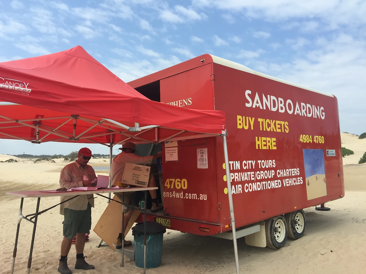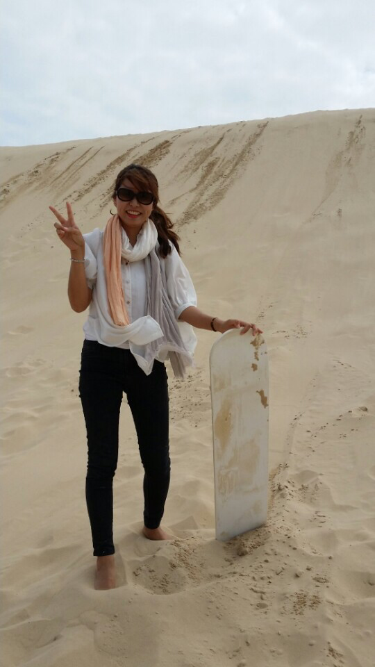 다음으로 포트스테판으로 이동. 하와이의 모래가 바람을 타고 넘어와서 사막을 이루었다는 곳인데 해안가 옆에 사막처럼 넓은 모래 언덕이 있는 곳이다. 그곳에서는 낙타 타기 체험, 샌드 보딩, 오토바이 등을 탈 수 있는 체험 코스가 있는데 원래는 포트스테판에서 샌드 보딩 할 생각이 없어서 그냥 가격을 물어보러 갔는데 1인당 한 시간에 25불인데 이제 마칠 때가 다 되어서 20불이란다. 우리 세 명 중 두 명은 하고 한 명은 구경만 하겠다고 했는데도 40불에 그냥 콜. 그렇게 우리는 샌드 보딩 업체의 차를 타고 모래언덕 중간에 가서 샌드 보딩을 정말 원 없이 탔다. 한인 여행사의 포트스테판 패키지로 가서 샌드 보딩 5번 탄 것이 가장 많이 탔다고 하는데 우리는 제한 시간 안에 얼마든지 더 탈 수 있는 것이라서 언덕을 올라서 타고 또 타고. 본전은 뽑은 것 같다. 아 렌터카를 빌리는 것이 이렇게 좋은 거구나.