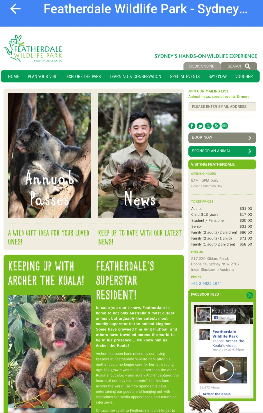 시드니 시내에 있는 와일드라이프 월드(Wildlife world)동물원는 대부분의 동물들이 철창 안에 있어서 에버랜드나 서울동물원을 갔다 온 사람이라면 실망일 것이라는 말을 들었다(시내에서 페리타고 가면 있는 타롱가주Taronga Zoo는 실제로 다녀온 연수생들의 의견은 괜찮았다 함. 멀리 가지 못한다면 타롱가주를 추천). 그리고 호주 현지에 살고 있는 한인 2세 대학생이 코알라와 캥거루를 가까이에서 볼 수 있는 곳으로 패더데일 동물원(Featherdale Wildlife Park)을 추천해 주었다. 다이엘라 교수님 역시도 이 곳을 추천했다. 그러나 가는데 학교에서 대중교통을 이용해서 한 시간 반 정도 걸리고 마치는 시간이 5시이기 때문에 평일에 가보기에는 조금 힘든 곳이었다. 주말을 이용하면 하루를 온전히 보내야 하는 상황.