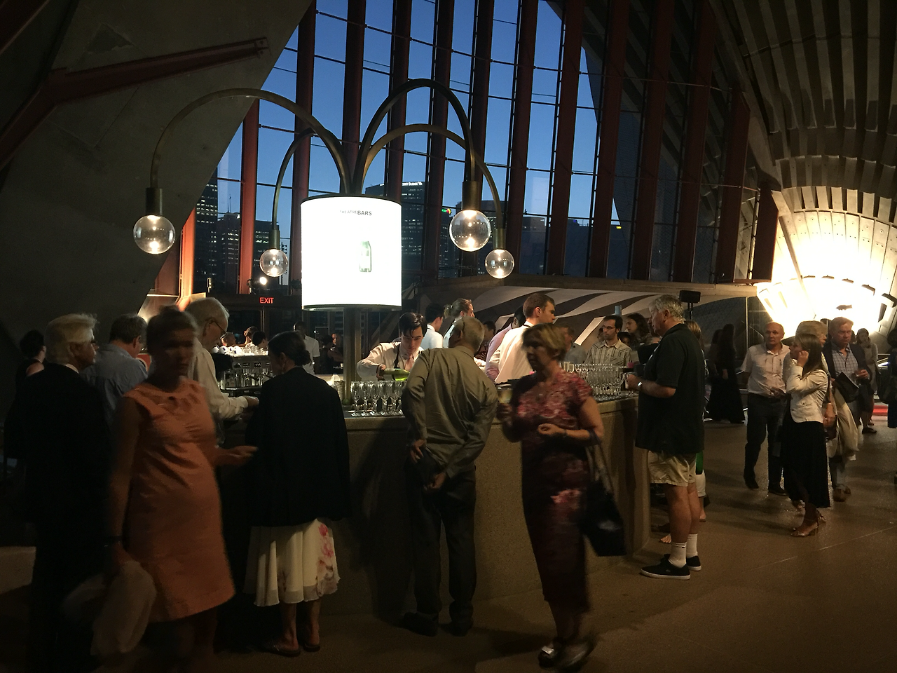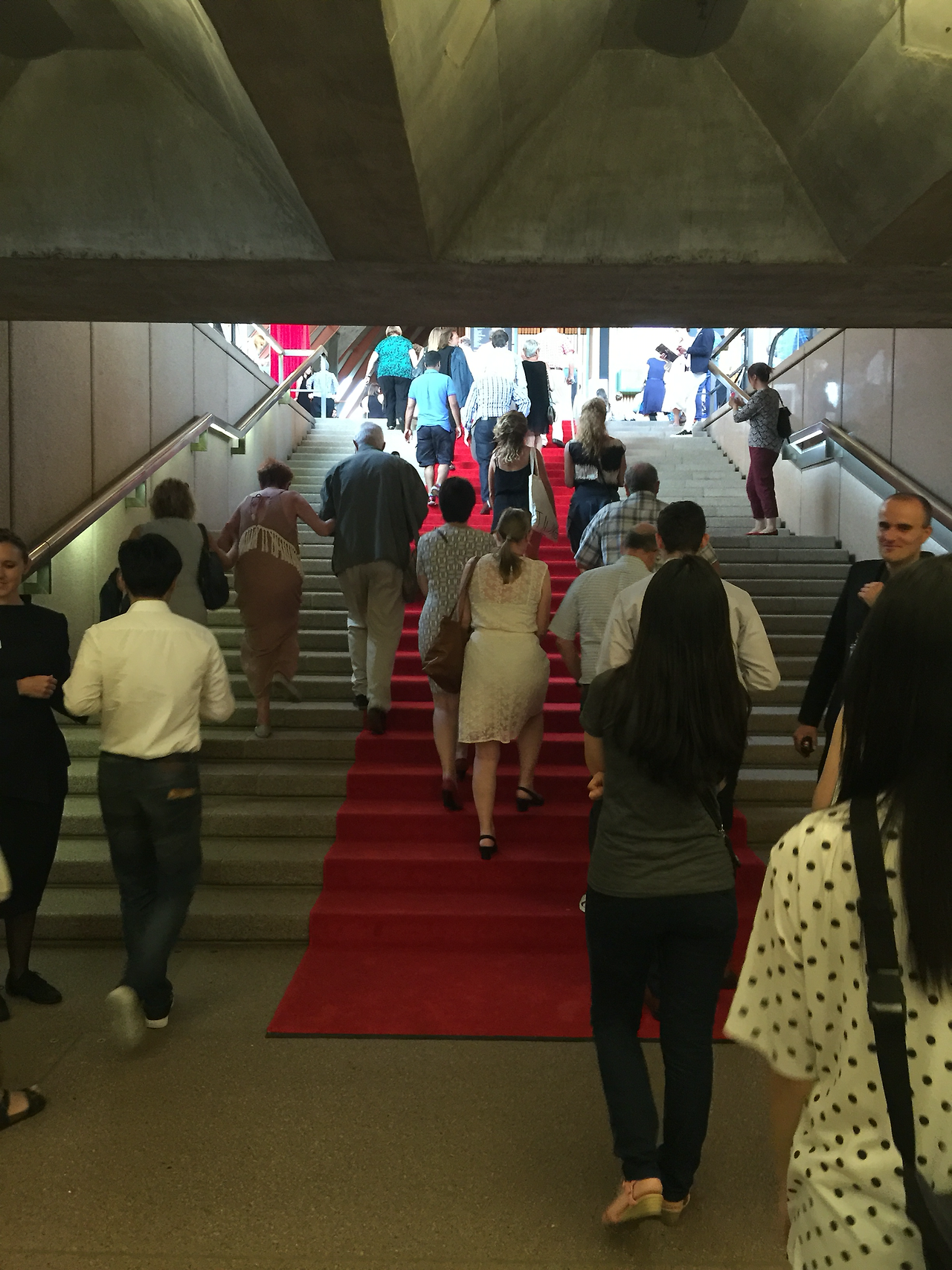 하버브릿지에서 내려오는 길에 그렌모어(Glen more pub)라는 현지인들이 찾는 맛집으로 피쉬앤 칩스(fish and chips 20$, BBQ ribs 26$ 정도)가 맛있다는 곳에서 저녁을 먹고 걸어서 오페라하우스에 오후 7시 도착하였다. 공연은 7시 30분 시작인데 역시나 다들 예쁘게 차려입고 커플들은 손을 잡고 여자를 에스코트하며 노부부 커플 역시도 다들 차려입고 왔다. 물론 가족끼리 오기도 하고 오늘은 한국인 팀도 많이 보였다. 그리고 공연장으로 가는 곳에는 레드카펫을 깔려있고 기념촬영장소도 마련되어 있었다. 그리고 올라가서는 공연 전에 바에서 와인이나 샴페인 한 잔씩 사서 들고 서서 오페라하우스 앞의 야경을 보며 담소를 나누고 기다리를 시간을 즐기고 있었다.