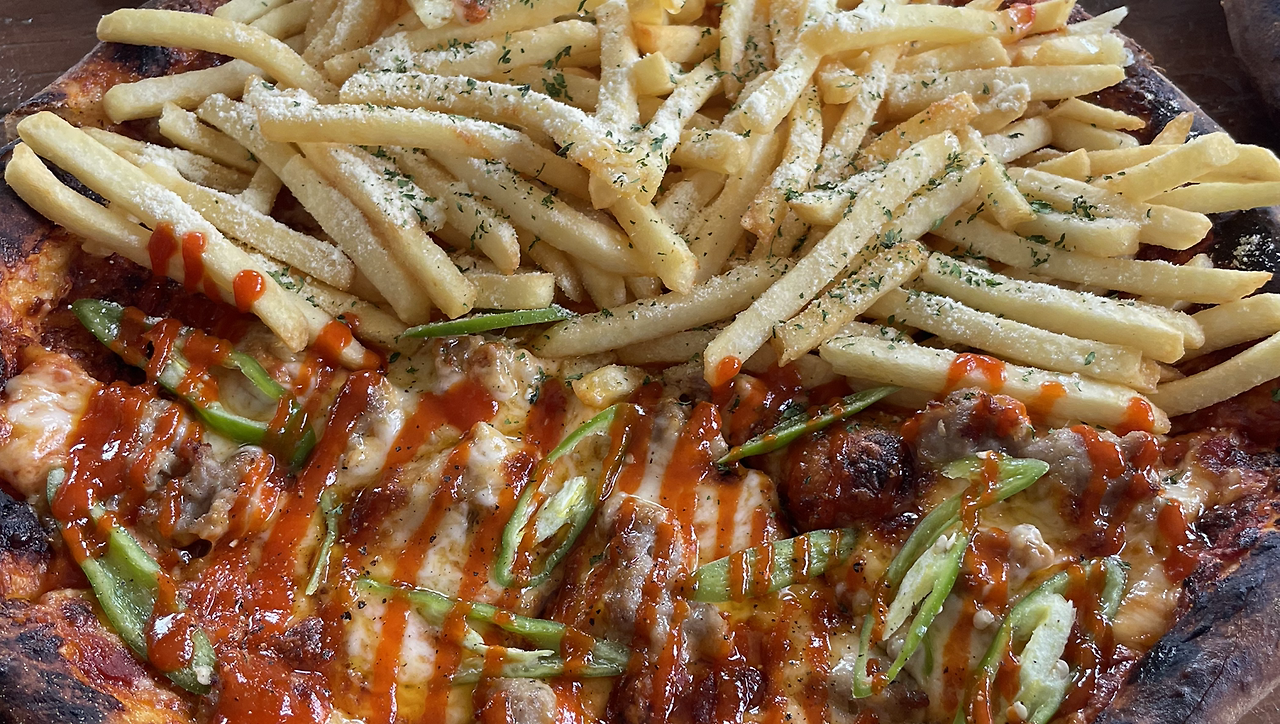 감튀를 잔뜩 올린 비주얼 갑 피자가 대표메뉴고, 우리도 기획 중인 메뉴라 참고가 될 수 있겠다 싶었습니다.