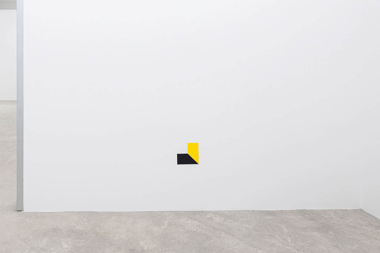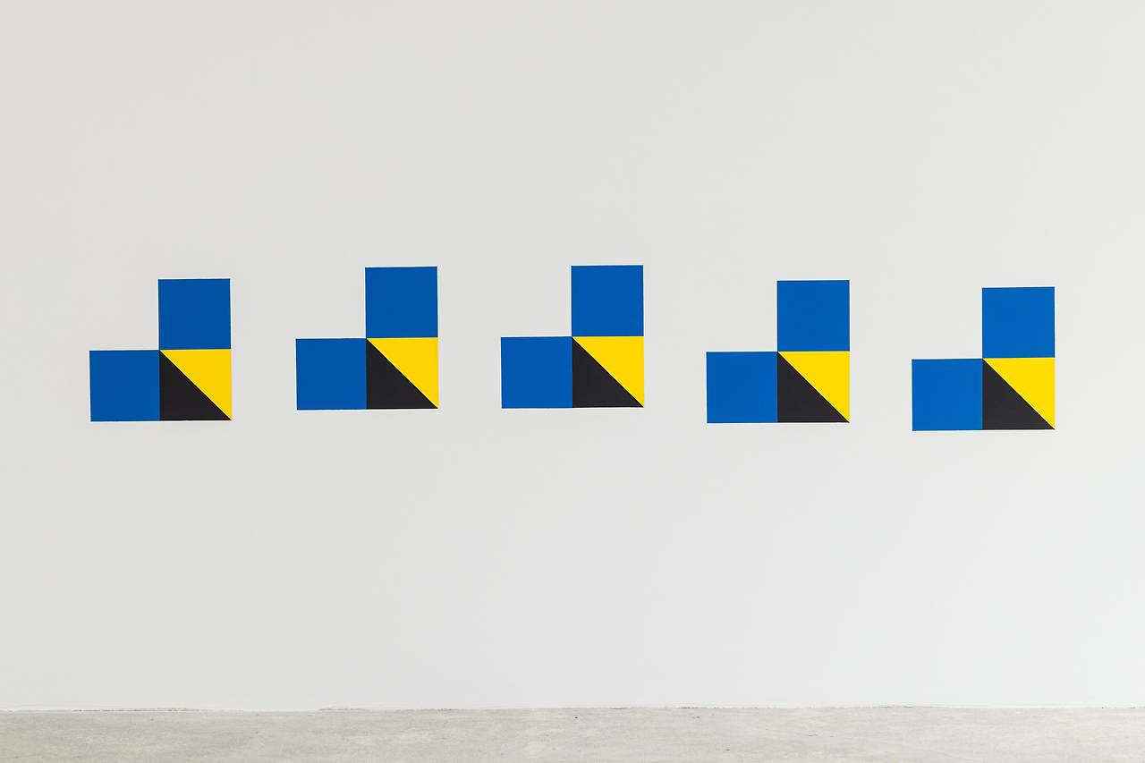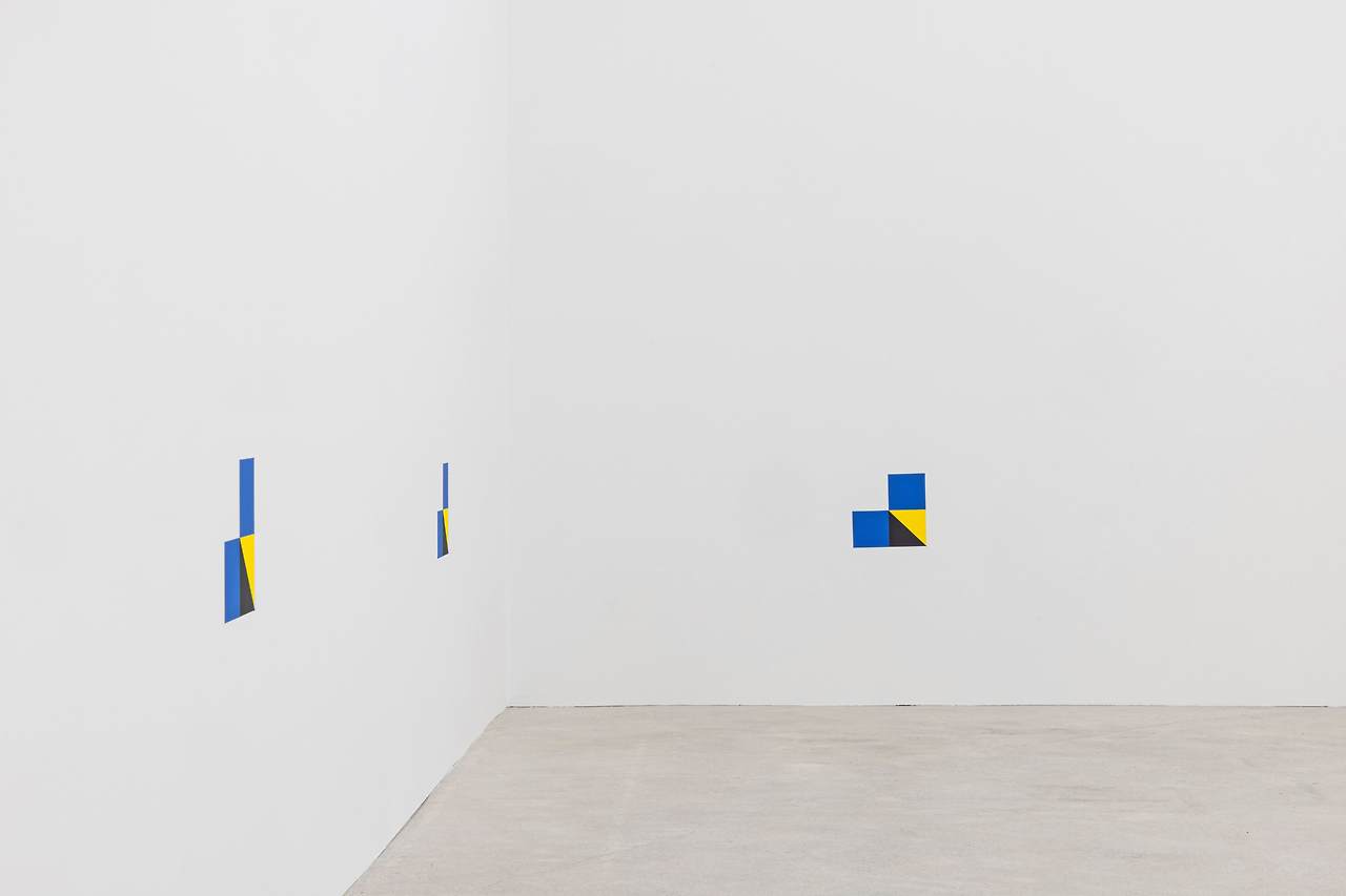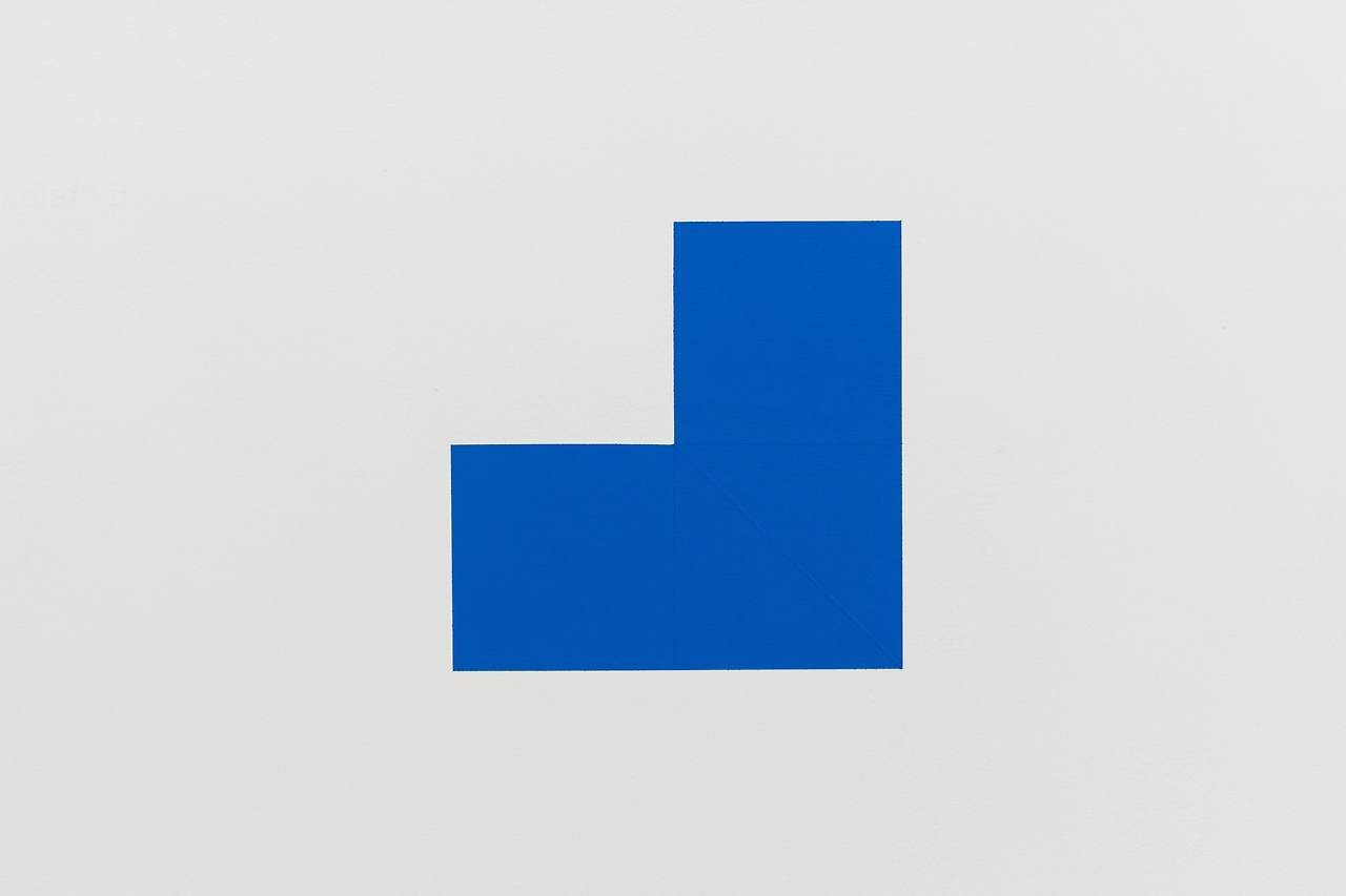 Wall Painting No.6 consists of wall paintings reminiscent of falling pieces of tetromino1) ) in a scene from the Tetris game. What Tetris and the wall paintings have in common is that they both operate on three axes: time, space, and direction. Several wall paintings resembling J-tetrominoes in Tetris are positioned on the white walls of the exhibition space, revealing a small but strong presence. Just as tetrominoes are made by connecting squares, each wall painting is composed of three squares and two isosceles triangles that fill one of the squares. Imagine a ‘J’ shape formed by three squares connected together, bending to the left. If you divide the square (□) sandwiched between the other two squares diagonally in the lower right corner (╲), you get two isosceles triangles (◺◹). The resulting figure, made up of three squares and two isosceles triangles, is the polyomino used in Wall Painting No.6. The three squares and two isosceles triangles serve as the basic units that make up Rahm Parc’s wall paintings.