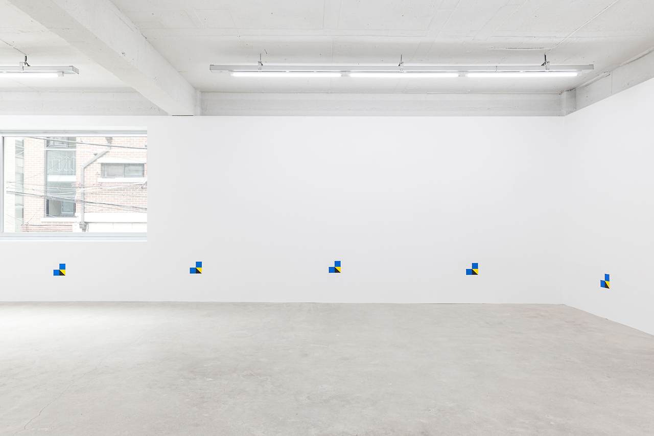 ㅤㅤIn Tetris, shapes flow from top to bottom, and what is filled needs to be emptied over time. Just as how tetrominoes fall from top to bottom, the wall paintings in the exhibition descend to the cells indicated by them. Unlike Tetris, the compass in the exhibition can point to other dimensions of space and time. First, let's imagine a spreadsheet (▦) with rows and columns added to the bottom right. In each wall painting, the two squares, extending to the left and upward represent the current state and starting point, while the two triangles between them signify the future state and destination. The square extending to the left indicates the rows of the spreadsheet, while the square extending upwards represents the columns. If the left square, representing the row, is black and the upper square, representing the column, is yellow, then this particular wall painting indicates the cell where the black row and yellow column intersect. The wall painting begins its movement from this cell. The two triangles between the squares signify the ‘arrival location’ and ‘future location’ of the cell that initiated the movement. The triangle at the bottom corresponds to the row of the indicated cell, while the triangle at the top refers to the column of the indicated cell. Therefore, the ‘wall painting with a black triangle at the bottom and a yellow triangle at the top between two blue squares,’ which appears several times in the exhibition, indicates to “start from the cell where the blue row and blue column intersect, and move to the cell where the black row and yellow column meet.” The wall paintings direct and reference each other according to the logic established by the artist, creating a flow of movement.