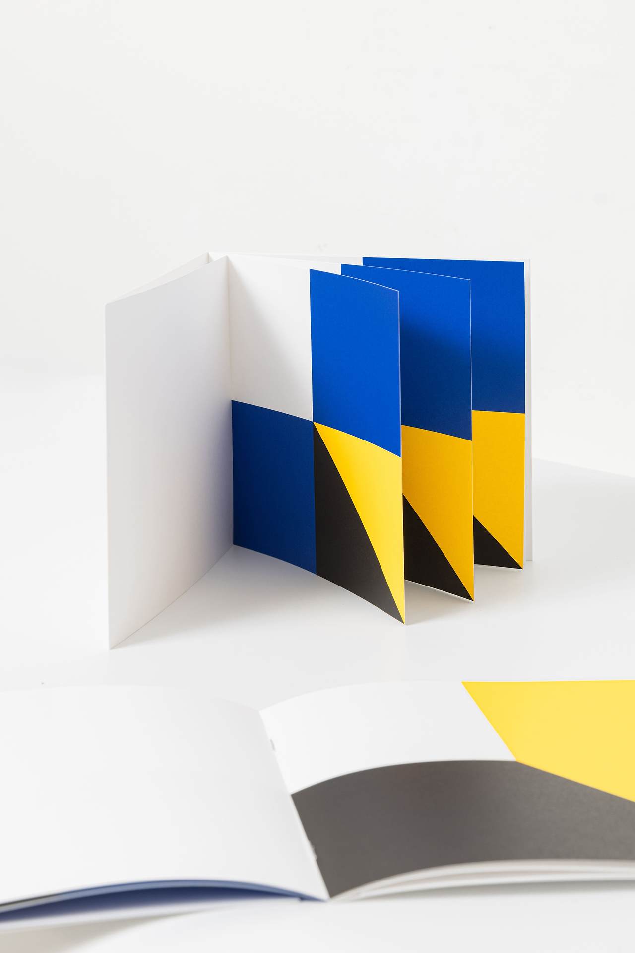 ㅤㅤ전시장에 들어가자마자 보이는 큰 방과 안쪽의 작은 방 곳곳에 위와 같은 기본단위로 구성된 벽그림이 있다. 벽그림은 두 개의 파란 정사각형과 그 둘 사이에 낀 노란색 삼각형과 검정색 삼각형으로 이루어져 있다. 공간을 걷다보면 파란색으로만 이루어진 도형도, 검정색과 노란색으로만 이루어진 도형도 찾을 수 있다. 멀리서 보면 하나의 색으로 이루어진 하나의 도형처럼 보이지만, 가까이서 보면 이들 역시 위와 같은 세 개의 정사각형과 두 개의 이등변 삼각형이라는 기본단위로 이루어졌다는 것을 알 수 있다. 같은 색으로 여러 번 덧칠되어 만들어진 물감층이 벽그림의 기본단위가 되는 도형들을 구분하고 있다. 이 벽그림들은 전시장에서 일종의 지시문으로 기능한다. 벽그림에 담긴 시간과 공간, 방향의 세 축을 읽기 위해 벽그림을 읽는 메뉴얼을 상상해 본다.