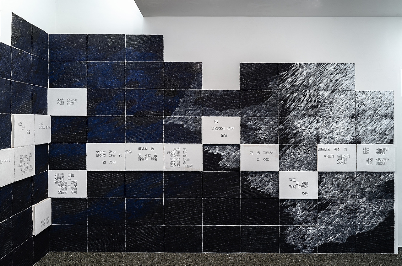 검푸른 밤에 입장해 볼까. 먼저 전시 《슬픔의 모서리》를 다듬어 보자. 전시장에 들어서면 일정한 크기로 자른 장지 드로잉이 이어 붙여진 벽면이 보인다. 드로잉에는 분채와 먹 등의 동양화 재료가 주로 사용되었는데 어두운 색감이 눈에 띈다. 벽면을 채운 어두운색의 드로잉1)은 하얀 벽과 경계를 이룬다. 이를 선으로 이어본다면 왼쪽 벽의 발목 위치에서 시작했던 경계는 정면 벽에서 눈높이까지 올라왔다가 벽이 모서리로 돌아서면서 급히 끝나, 볼록한 언덕 형상을 그린다. 언뜻 검은 단면처럼 보였던 드로잉은 가까이 다가가 보니 선들의 집합으로 이루어져 있었다.