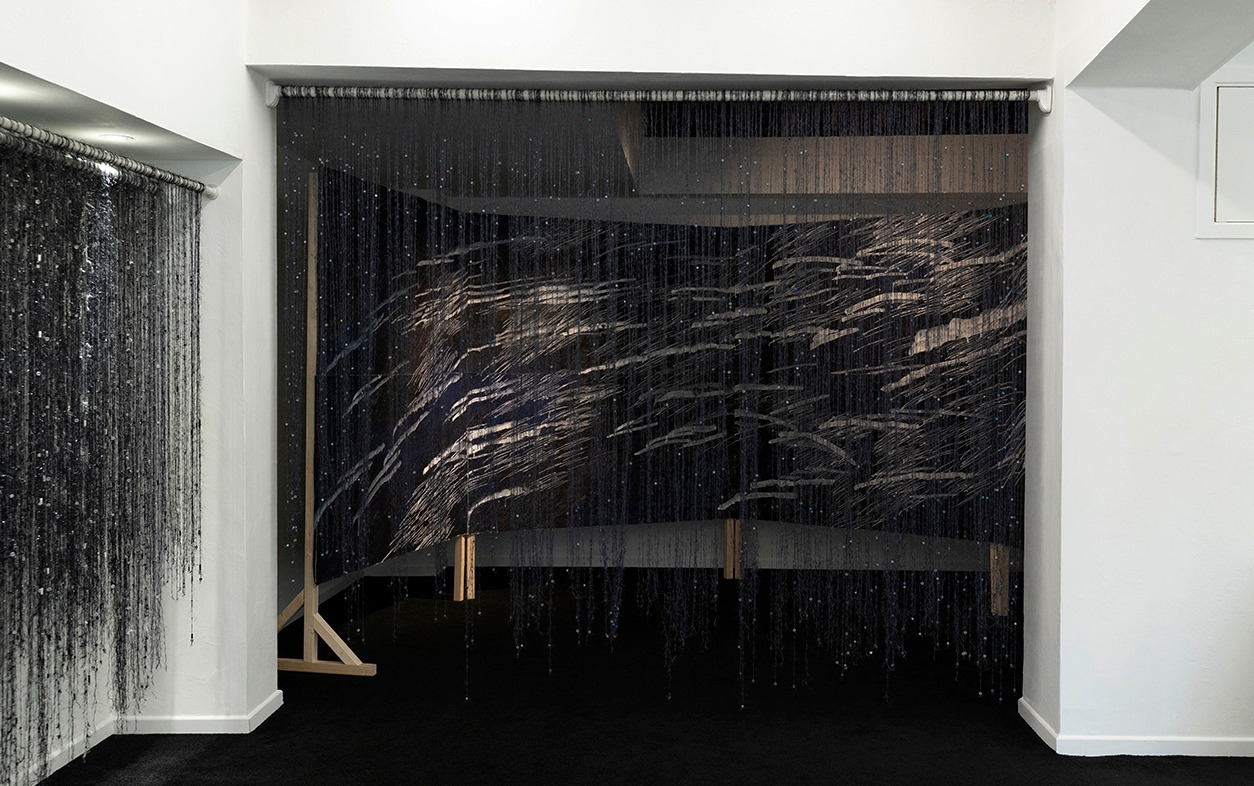 ㅤㅤ뒤를 돌면 작고 어두운 방이 기다린다. 방의 통로에서는 부스스한 질감의 남색 실에 자개처럼 빛나는 구슬을 걸친 커튼 〈바람버들 #02〉5)가 반겨준다. 검은 실을 걷어 방 안쪽으로 발걸음을 움직인다. 방에 들어서면 키 높이의 서로 이어진 그림 〈잠잠한 걸음 - 함께〉가 나를 둥글게 둘러싸 깊은 밤으로 초대한다. 다시 커튼을 걷어 방에서 나오니, 조금 전에 마주했던 한낮의 빛이 한층 더 선명하고 눈부시다. 밤중의 별빛과 달빛은 우리를 밤으로부터 서서히 멀어지게 한다. 그리고 검푸른 밤을 빠져나오면서 우리는 밤과 완전한 작별 인사를 할 수 있게 된다.