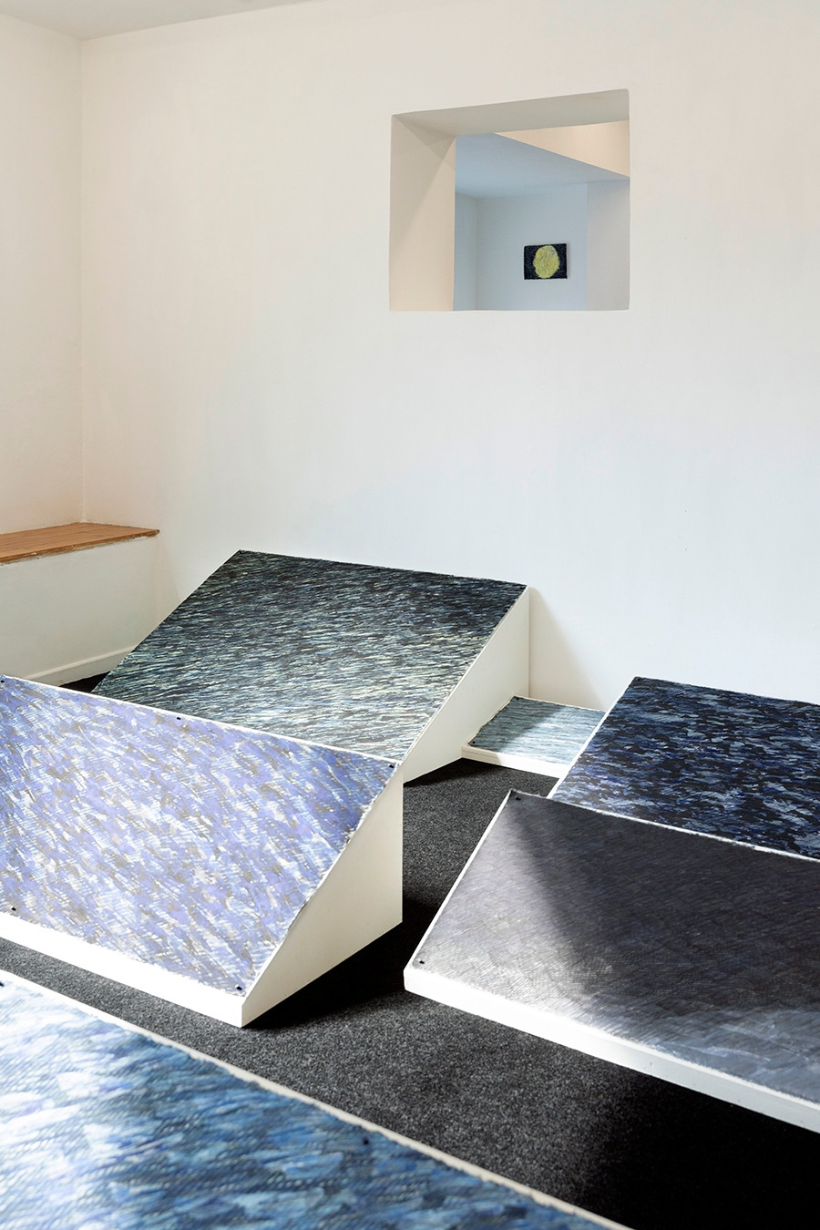 3) 《슬픔의 모서리》에 전시된 〈머무는 오늘〉은 47.2 × 72 × 40.5cm 크기로 1개가, 《긴 밤 그림자》에 전시된 〈머무는 오늘〉은 각각 43 × 120 × 32.6cm 크기로 총 3개가 전시장 곳곳에 놓여 있었다.