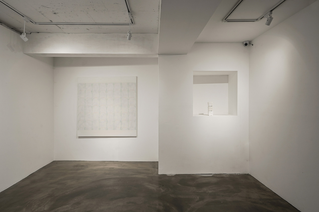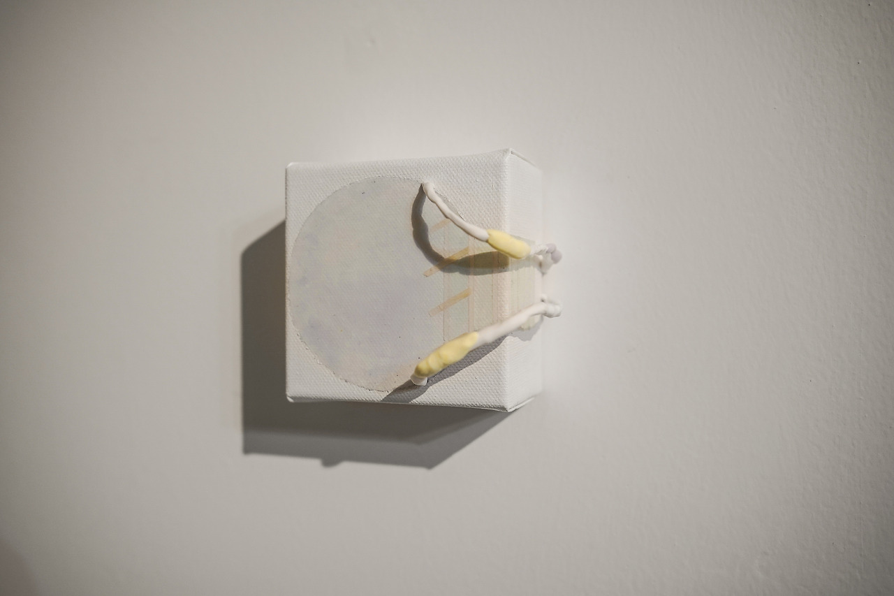 《마디와 마디》라는 전시의 제목은 평면 작품과 조형 작품을 신체의 어느 한 부분으로 바라보게 한다. 회화의 이미지는 캔버스 전면을 채우는 배경색과 그 위에 부조처럼 올라간 작은 밀랍 모형으로 구분할 수 있다. 배경은 미색으로 이루어져 있으며 그 위에 밀랍은 뼈나 마디를 단순화한 길쭉한 도형으로 올라가 있다. 팔꿈치나 무릎과 같은 신체의 특정 부위를 그려내는 이 도형은 사각형을 이루며 모여 있고 그 반복은 패턴을 형성한다. 이 뼈대들은 가장 효율적인 위치에 자리를 잡은 것 같기도 하고 가장 아름다운 위치에 자리를 잡은 것 같기도 하다. 그런가 하면 전시장의 다른 곳에는 근육과 뼈마디를 느슨하게 재현한 입체 캔버스 <마모되는 부위>시리즈와 석고 조형물 <토막>이 보인다. 부분으로서의 뼈대라는 자리를 이탈한 이들은 아슬아슬한 무게 중심으로 쌓여 있고, 그림에서와 마찬가지로 일렬로 줄 서 있다. 이것이 뼈대라면 이 근처에 또 다른 신체 부위가 있을지도 모른다. 분명하게 명시되어있지는 않지만 페인팅의 표면은 피부를 연상시킨다. 작가가 직관적으로 사용하는 언어가 ‘뼈’와 ‘마디’라면, ‘피부’는 작품에서 살펴보아야 할 또 다른 질감은 아닐까? 화면의 중심을 차지하는 뼈대가 아닌, 피부라는 이 캔버스의 가장자리에서부터 작품을 매만져본다.